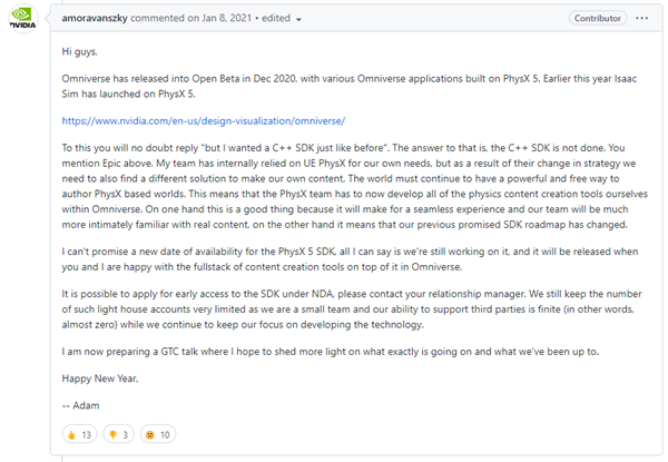 2018年,NVIDIA首次将自家的物理引擎PhysX开源,并在之后进行了一段时间的更迭维护。 但在2019年末,GitHub上NVIDIA的PhysX项目页的版本却停留在了4.1,并未同步更新PhysX 5.0,面对用户的追问,也仅仅表示“会有的,在做了”,却毫无动静。 “在做了” 现在,距离上次更新时隔2年,NVIDIA终于开源了最新的PhysX 5.1 SDK,总计包含了66.2万行代码、文档和相关资产。 据悉,PhysX是一个可扩展的多平台物理解决方案,能够支持从智能手机到PC的大部分设备,并已经集成在了虚幻和Unity等主流引擎中。 而最新的PhysX 5.1则包含了此前的NVIDIA Felx库功能,并有了符号距离场碰撞功能。 同时,PhysX 5.1允许用户定义自定义几何图形,且大型模拟的CPU和GPU并行计算性能都得到了显著提升。 对此感兴趣的开发者,可以前往NVIDIA PhysX的GitHub页面进行查看与下载。 |