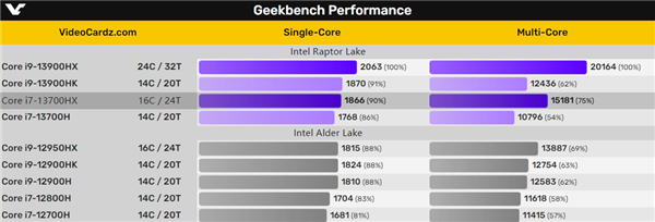 一般来说,产品档次越高,规格越高,层次分明,但有时候也有一些特殊的例外。 GeekBench 5数据库内出现了一款“i7-13700HX”,显然是Intel 13代酷睿HX系列移动版的一员,8大8小16核心24线程,大核二级缓存每核心2MB,三级缓存共计30MB,频率2.1-5.0GHz。 该系列之前已经出现过i9-13900HX,也是8+8 16核心,但频率不详。 不出意外,它们的基础功耗将和12代HX系列一样,都是55W。 有趣的事情就来了,根据曝料,13代H45系列的旗舰型号i9-13900HK,只会有6+8核心,还不如i7 HX。 事实上,这一代也是如此,H45系列的i9-12900HK、i9-12900H都是6+8核心,HX45系列的i7-12850HX、i7-12800HX则都是8+8核心。 说起来太乱太难懂,看下图吧: 不过,HX 55W系列的应用非常少,只有一些极端发烧游戏本使用了顶级的i9-12950HX、i9-12900HX,预计13代也会是类似的情况。 回到i7-13700HX,它的GeekBench 5单核跑分为1866,基本上和i9-13900HK同一档次,多核跑分为15181,凭借多出来的2个大核领先i9-13900HK 22%之多。 |