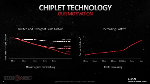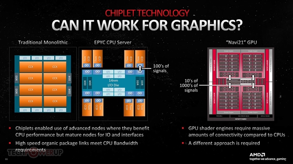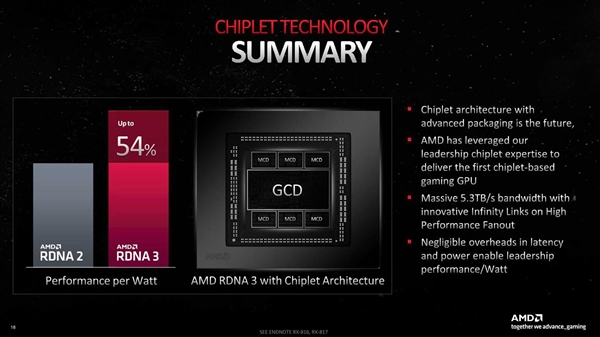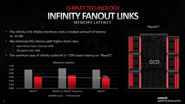 AMD RDNA3 GPU架构第一次引入了chiplet小芯片设计。这种架构在AMD锐龙、霄龙处理器上已经玩得炉火纯青,来到显卡上有什么不一样呢? 一如在处理器上,AMD显卡这么做也是出于单个芯片越做越庞大、成本越来越高,必须改变思路的考虑,而为了解决多芯片彼此之间的通信带宽、延迟问题,AMD也是用苦良心。 AMD RDNA3包括一个GCD图形核心、最多六个MCD显存与缓存核心,其中关键的Infinity Cache无限缓存没有放在GCD之中,而是位于MCD里边。 GPU与显存之间的互连通道叫做Infinity Link(无限连接),其传输率高达惊人的9.2Gbps。 什么概念?这是AMD锐龙、霄龙处理器上Infinity Fabric通道带宽的10倍之多! 另外,GCD、MCD之间的峰值带宽也高达5.3TB/s。 小芯片设计不可避免地会增加延迟。数据显示,Navi 31如果延续Navi 21的运行频率,显存、无限缓存访问延迟都会增加。 AMD通过将核心频率提升18%,Infinity Fabric总线基准频率提升多达43%,解决了这一问题,显存访问延迟基本不变,无限缓存访问延迟反而还降低了10%! RDNA2架构的频率本来就不低,RDNA3更进一步,STA(静态计时分析)工具显示提升幅度约有30%,不过实际运行频率没有拔高这么多。 RX 6950 XT的游戏频率、加速频率分别为2.1GHz、2.3GHz,RX 7900 XTX则分别是2.3GHz、2.5GHz。 当然,如今GPU的标称频率只是个参考值,实际运行中能达到的都远高于此。 |