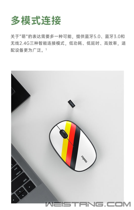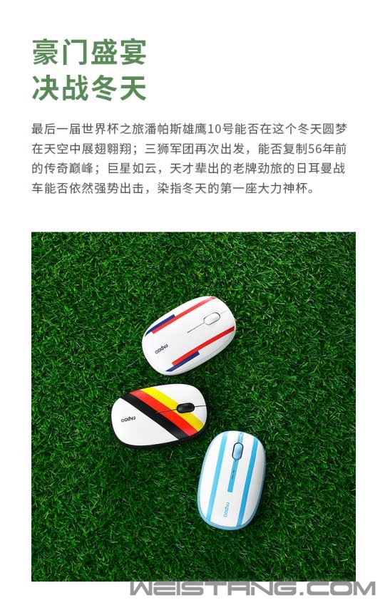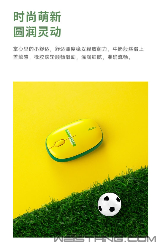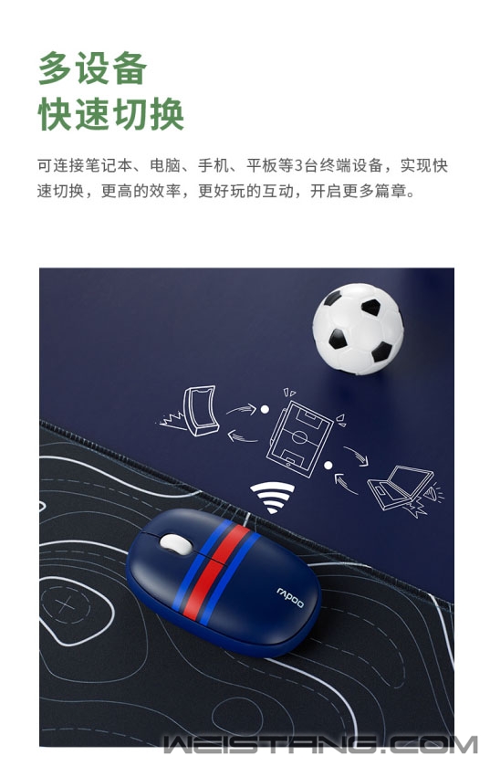让无数球迷疯狂,让热爱集结的世界杯赛事即将开幕,在球迷的期待中,RAPOO雷柏也为此推出了M650多模无线鼠标球迷节日版,6只球队的象征,唯一不变的是对于足球共同的热爱,不仅是一份对于篮球的信仰,也是一款办公助手,接下来让我们来看看。 M650多模无线鼠标拥有6只不同球队配色,分别为桑巴军团、橙色军团、高卢雄鸡、潘帕斯雄鹰、三狮军团、日耳曼战车。究竟那只球队能在这个冬天大放异彩,让我们一起拭目以待。 握在掌心里的小舒适,舒适的弧度支撑掌心释放M650的萌力。牛奶般丝滑的上盖触感,橡胶滚轮的顺畅滑动,给予白领们舒适的操作体验。 M650拥有轻揉的硅胶圈,有效增强握持的舒适感,更亲肤,更耐磨,将萌力进行到底。 M650提供蓝牙5.0/3.0和无线2.4G三种智能连接模式,传输稳定可靠,即便是接收器丢失或USB口不足也不影响使用。最多可连接3台设备,键鼠可在各个设备间快速切换,让你在追寻热爱时也能从容应对繁杂工作,化身职场达人。 鼠标1300DPI的寻迹引擎,反应灵敏,在皮革、布匹、纸张等表面使用,亦能准确定位,让你随时进入工作状态。 静音微动的加入有效减少使用噪音,打造一个宁静的办公环境,适宜图书馆等环境使用。可拆卸的磁吸式上盖除了萌趣十足,为电池、接收器的收纳提供便利。 左右对称的舒适握感人体工学设计,既可爱又梦幻,轻巧便捷。1节AA电池,提供了9个月的续航动力,活力满格。 |