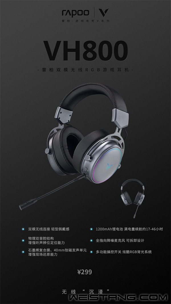【雷柏无线游戏外设全家桶6件套】新晋成员:VH800双模无线RGB游戏耳机。 “双模无线连接”“物理双音腔结构”“石墨烯材质复合膜片”,精准舒适,随需而变,是VH800的核心词,也是认知向往的感官形容词。佩戴即自由,为听辨赋予精度,雷柏无线游戏外设全家桶6件套全系集结,无线游戏的核心生产力,跟游戏玩家共情多一点。 服从核心诉求,遵从实战至上 无线连接的核心,低延迟、高稳定。VH800支持高速无线连接(插接收器连接使用)与普通无线连接(蓝牙连接使用)两种模式,适配不同设备,带来更多竞技的可能性和可玩性。当竞技多巴胺弥漫神经,无论是在室内端游鏖战还是外出手游solo,随时就绪,时即刻开冲! 沉浸体验的核心,减少失真、精准输出。让无线游戏耳机更专业,性能猛兽贴耳感受,物理双音腔结构是VH800的强大核心,一个音腔负责传播高频与中频声音,另一个音腔只输出低频声音,通过分离低音音频,独立调校输出,避免了相互干扰,减少失真后音频更清晰、通透。 实战中,双音腔会令敌人的脚步声、枪炮声这一类低音更突出,40mm钕磁发声单元,采用单张成型复合膜石墨烯材质,在超薄厚度的情况下具备强劲的韧性与延展性,动态范围更广,解析复杂的战争游戏音效,还原了精准至上的体验感,丝滑落地抢先刚枪,千里狙击,一击致命。 交流的核心,全指向、降噪。随着移动端游戏产品的爆发,让游戏内的语音交流成为天南海北的玩家社交的刚需,VH800可拆卸360°全指向麦克风,高灵敏降噪,嘈杂环境也能保障传输沟通信号的稳定清晰。 服从核心诉求,佩戴舒适至上 佩戴的核心,持久性、舒适性。耳机线条脉络锐利,金属可伸缩单头梁搭配包耳式蛋白皮耳罩,适应不同头型的同时降低佩戴压迫感,触感柔软的记忆海绵耳罩包裹其中,两者结合无论是“激情拉满”的持久组排,还是音乐、大片观影的耳机持续体验,均能解锁你的感官舒适区,满足你对惬意的想象。内置1200mAh可循环充电锂电池,满电续航可达约17-46小时,氛围持久,放胆开战! 视觉的核心,个性化、先锋化。VH800游戏耳机用幻彩打破沉闷,耳壳处围绕幻彩RGB灯效,中间注入游戏V系列DNA,以科技勾勒进阶魅力,氛围灯诠释游戏乐趣。耳壳边缘集成音量调节滚轮、背光开关、麦克风开关、电源键、模式切换等多功能按键,迅速便捷。 双模无线连接、物理双音腔结构、石墨烯材质,服从功能,不留于表面硬核开局。用沉浸式体验为产品创新理念,无线游戏外设满足不同场景需求,“灵活操控”、“娱乐生活”、“精准反馈”高度统一。雷柏无线游戏外设全家桶6件套,雷柏VH800双模无线RGB游戏耳机,售价299元,现已上市! |