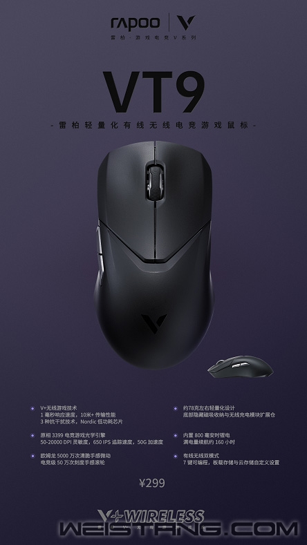 轻量化设计,高性能、长续航,搭载低延迟、长续航、远距离、抗干扰V+无线游戏技术与至高160小时续航,展现真正的游戏实力,底部隐藏式磁吸收纳仓,解决接收器易丢失烦恼,78g轻盈的体验感、高强的性能与贴心的细节,用299元极具性价比的价格定义轻量化无线电竞鼠标。 雷柏VT9鼠标约78g重量左右,外壳纤薄,移动整体轻盈与耐用并存,人体工学左右对称的设计,支持抓/捏/趴三种不同握姿,使用时保持舒适握持感。长时间操作也能舒适有佳。至高20000DPI七档可调的原相3399游戏引擎搭配搭载雷柏V+无线游戏技术,准确捕捉每一帧,内置欧姆龙5000万次微动,搭配电竞型50万次刻度手感滚轮,触发更迅速,点击力度更均匀,疾速响应防误触。体验高性能猛兽带来的游戏乐趣。 鼠标800毫安时可循环充电锂电池,搭配新升级低功耗无线技术,至高可达约160小时续航使用,USB-C连接充电,3小时充满。搭配底部采用特氟龙脚垫,低摩擦、耐磨、实现快速顺滑操作。底部设有隐藏型磁吸收纳仓与无线充电模块扩展仓,放置/取出便利自如,避免接收器易丢失烦恼。并且具有开核增值,VT9底部隐藏无线充电模块扩展仓,玩家可通过购置无线充电模块,开启更方便快捷的充电体验,也预示着未来更高效的无线畅玩桌面。 提供10键可编程,驱动可设置多种扩展功能。亦可保存多组配置文件,实现多场景切换操作,登录V系列智能云存储,可将配置文件上传至云共享,分享给其他玩家。在细节方面也是做到了兼顾,给予玩家更舒适的操控选择。1.8m伞绳材质的电源数据线,镀金的USB接口,USB转接器,按键防滑贴&备用脚贴的加入,种种的细节让玩家得到更完美的游戏体验。重新定义高性价比旗舰机无线鼠标! |