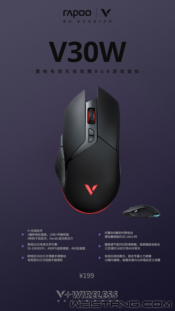 临危不乱,冷静狙击!瞬狙,点射,扫射等多指高端操作一气呵成。 有请让人血脉喷张,自带超感气场的雷柏V30W双模无线游戏鼠标。“攻与守”,“160小时续航与10键可编程”,雷柏V+无线游戏技术将精准狙击的态度完美呈现。 精准掌握,吸睛的秘诀一: “高级脸”舒适度的描述,由感官划定最为精确,射击操控手感外观,非对称锋锐造型是一种野性的呈现方式,而内凹左侧面宽大的侧翼,为大拇指提供了承托,是美学的舒适主义。 能看又能打,三区域RGB背光五种灯效,标志性的logo灯、尾部灯带、滚轮灯,接下来,为你亮灯。 精准掌握,吸睛的秘诀二: “快准稳”硬核实力,满足FPS游戏的更多可能性。身怀绝技的V30W,核心能量V+无线游戏技术,1毫秒响应速度;10米+无线传输性能;3重技术抗干扰,时刻保证在高速移动中的稳定性,保证多台无线设备同时响应操作的稳定性。 原相3335电竞游戏光学引擎,50-16000DPI灵敏度,支持50为单位逐级调节,400IPS追踪速度,40G加速度,与此同时,手感“滚烫”, 欧姆龙2000万次清脆手感微动、电竞型50万次刻度手感滚轮,也增添了表面的触感,状态起飞。 机智灵活,沉着冷静的超神组合,V30W先手制胜,鼠标侧裙搭载火力键,一键连击,通过驱动软件可将它设置为狙击键,快速降低DPI,秀操作,提升射击精准度、稳定性。10键可自由编程,驱动更可支持设置多种扩展功能,多组板载存储,智能云存储,玩家可以根据自己的操作习惯修改战术按键,扩大操作自由度,冲上荣耀枪王。 摆脱线性束缚,定义无线竞技空间。全新升级低功耗无线技术,搭载Nordic低功耗芯片+,配备800毫安时可循环充电锂电池,约3小时即可充满电,满电可稳定持续使用20-160小时,从此自由随心做枪神。“顶尖”的诚意之作,1.5m以上长度的伞绳材质电源数据线、镀金USB接口、USB转接器、按键防滑贴,底部磁吸USB接收器收纳仓,齐全体验,透着的不仅是新意,也是诚意。 雷柏无线外设游戏全家桶6件套,FPS场景化,对味了吗?点击视频,看雷柏V30W双模无线游戏鼠标如何实现,无线甩狙,精准击杀。 |