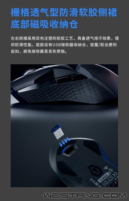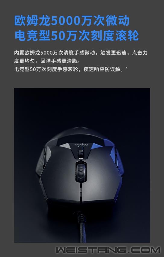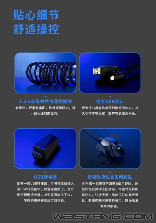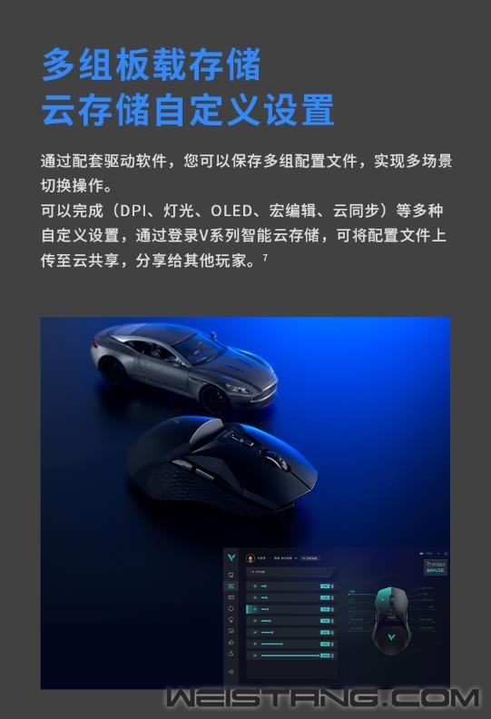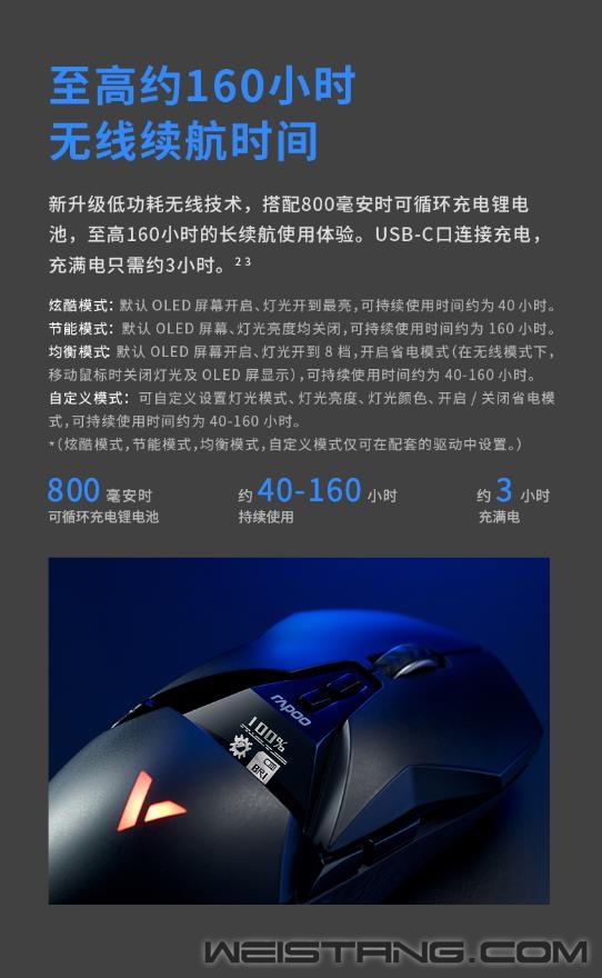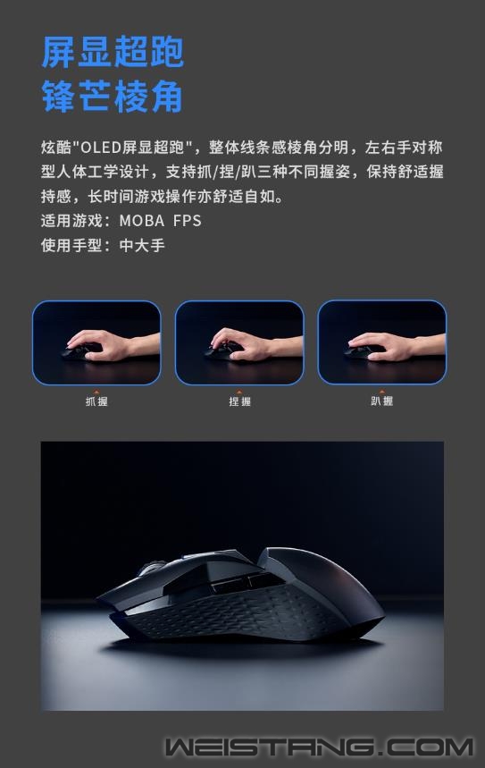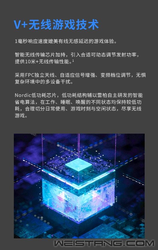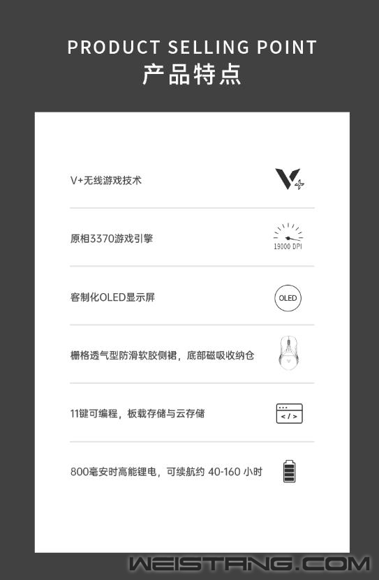 雷柏V+无线游戏技术,产品力、品牌力,硬实力。原相3370光学引擎加持、1毫秒响应速度、至高160小时续航,搭载雷柏V+无线游戏技术的首款无线双模游戏鼠标VT950S正式推出,接下来让我们一起来看看这款299元无限潜能的表现吧。 VT950S作为一款炫酷的“OLED”屏显超跑,整体线条感棱角分明,左右手对称型人体工学设计,支持抓/捏/趴三种不同握姿,保持舒适握持感,长时间游戏操作也舒适自如。,也适合MOBA,FPS类的竞技游戏。 VT950S拥有雷柏V+无线游戏技术的加持,1毫秒的响应速度,媲美有线无感的延迟体验。智能无线传输芯片的加持,提供10米+的无线传输性能。采用FPC独立天线,自适应信号增强,变频档位调节,无惧复杂环境中的多设备干扰。Nordic的低功耗芯片,辅以智能的省电算法,合理切分日常使用、游戏时刻与空闲状态,尽享无线游戏。 新升级的低功耗无线技术,在800毫安时的锂电池下给鼠标带来了至高160小时的长续航使用体验。USB-C连接充电的接口,3小时即可充满电量,开启超长的无线游戏体验。 采用了原相3370电竞级光学游戏引擎,准确定位每一帧,1ms的疾速响应,能更好的帮助玩家实现游戏中各种细节微操。帮助玩家更好打出走A、光速QA等细节连招,好比一款物理外挂。预设800/1200/1600/2400/3200/6400/19000,7档可循环切换DPI。11个可编程按键通过驱动设置,根据不同游戏调节适合自己的灵敏度,录制自定义宏,化繁为简,方便快捷。 内置5000万次欧姆龙微动开关,持久耐用,手感爽脆,回弹迅速,电竞型50万次刻度滚轮,疾速响应防误触,不在为鼠标寿命而担心。 VT950S的特氟龙脚垫,为鼠标带来低摩擦、耐磨、快速顺滑的操作移动,瞄准操作几乎不受阻力影响。 一块0.66英寸的客制化OLED显示屏安置在鼠标上方,拥有64*68分辨率,可实时显示鼠标的性能状态,让你实时知晓鼠标当下的性能数据,知己知彼、百战不殆。同时,这块屏幕也可以客制化显示图片、文字等,将个性呈现发挥到极致。 VT950S采用了栅格透气行防滑软胶侧裙,以及底部的磁吸收纳仓。具备透气排汗效果,避免接收器易丢失的烦恼。 作为雷柏游戏鼠标新旗舰的VT950S,雷柏也为其配备了功能强大的专属驱动软件,可以完成对VT950S几乎所有的设置如DPI、灯光、OLED、宏、云同步等操作,化繁为简,开启智慧游戏新时代。 VT950S在细节方面也是做到了更贴心的装备,给予玩家更舒适的操控选择。1.8m伞绳材质的电源数据线,镀金的USB接口,背光型的USB转接器,按键防滑贴&备用脚贴的加入,种种的细节让玩家得到更完美的游戏体验,新一代旗舰顶尖鼠标VT960S你值得拥有。 |