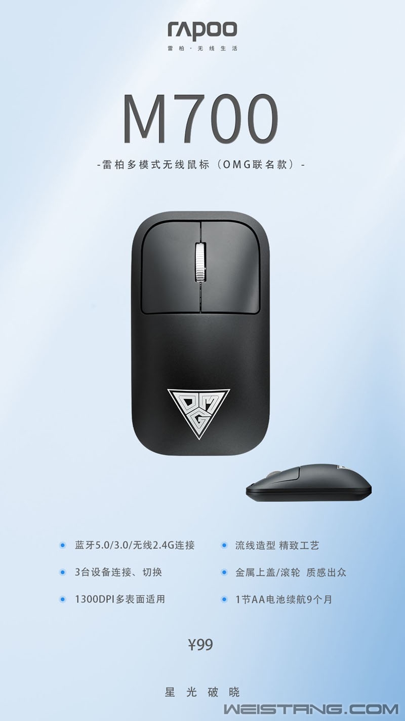 每一次在黑暗中逐光与自我碰撞,该如何呈现热爱与竞技?或许战队标志性黑色与简练的金属工艺可以诠释更多灵魂与力量。“斩断枷锁,星光破晓”,雷柏游戏 X OMG电子竞技俱乐部英雄联盟战队,借日常之物,凝聚队魂精神以产品结构作为呈现——雷柏M700多模无线鼠标与游戏鼠标垫联名款,是游戏与现代生活的融合,是热爱在生活中的延伸。 视觉x触感x精细 战队标志性设计颜色、LOGO与现代生活的冲突与融合,让M700多模无线鼠标拥有自成一派的独到风格,重新定义了M700的设计语言。熔铸漆黑全金属的一次冲压成型鼠标上盖,饱满的曲线线条赋予它带有力量感的车身造型,独具辨识度更显从容霸气,任何时刻都散发着凌厉姿态。 时尚的造型,澎湃的力量,酣畅的快感,解锁视觉、触觉双重新体验。鼠标上盖的细腻磨砂表面处理起到防滑防汗作用,左右手对称设计,适配中小手型用户,无论是习惯趴握或是抓握均能带来舒适掌控。呼应尾部OMG LOGO配色的银色金属滚轮,左右轻音按键微动,1300DPI高精度寻迹引擎,支持多种介质表明使用,满足我们不同生活场景的使用,亦兼顾了舒适性和兼容性。 性能x速度x 精准 星河璀璨,放胆逐梦,用多一种方式。M700多模无线鼠标支持蓝牙5.0、3.0和无线2.4G三种智能连接模式,可快速连接切换3台终端设备,为热爱释放提供多一种可能,为效率提升更跃上一阶。出色的续航时长,只需1节AA电池,即可提供9个月续航时长,满载实力。 个性化定制扩充生活与娱乐交融的新组合,以主题概念视觉图为设计的联名款鼠标垫,大胆诠释了“破枷锁”的决心。340*290mm大尺寸设计,5mm厚度,细面网状材质+橡胶基底双层工艺,整齐线材锁边,紧实顺滑,提供高追踪、顺畅疾速的体验,只为将战场上的每一次进攻机会完美捕捉。 热爱,是竞技取胜的关键。装备,是释放热爱的前提。追逐热血涌动,雷柏游戏 X OMG英雄联盟战队联名款外设,向着星的光芒前行。 |