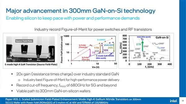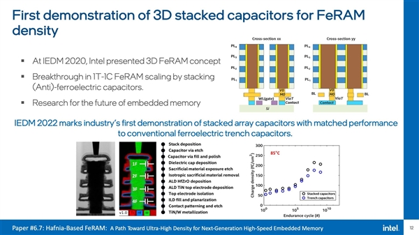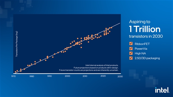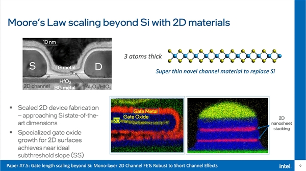 晶体管数量/密度一直是衡量半导体技术进步的重要指标,目前已经可以做到单芯片1000多亿个晶体管,比如Intel Ponte Vecchio GPU。 IEDM 2022 IEEE国际电子器件会议上,Intel公布了多项新的技术突破,将继续贯彻已经诞生75年的摩尔定律,目标是在2030年做到单芯片集成1万亿个晶体管,是目前的10倍。 摩尔定律原型 从应变硅、高K金属栅极、FinFET立体晶体管,到未来的RibbonFET GAA环绕栅极晶体管、PowerVia后置供电,再到2.5D EMIB+3D Foveros、Foveros Direct/Omni封装技术,Intel一直在从各项技术上推动摩尔定律。 IEDM 2022会议上,Intel披露了三个方面的技术突破: 1、下一代3D封装准单芯片 基于混合键合(hybrid bonding),将集成密度和性能再提升10倍。 同时,间距缩小到3微米,使得多芯片互连密度和带宽媲美如今的单芯片SoC。 2、超薄2D材料在单芯片内集成更多晶体管 使用厚度仅仅3个原子的2D通道材料,Intel展示了GAA堆栈纳米片,在双栅极结构上,在室温环境、低漏电率下,达成了非常理想的晶体管开关速度。 第一次深入揭示了2D材料的电接触拓扑,可实现更高性能、更有弹性的晶体管通道。 3、高性能计算能效、内存新突破 Intel研发了可垂直堆叠在晶体管之上的全新内存,并首次展示了全新的堆叠铁电电容,性能媲美传统铁电沟道电容,可用于在逻辑芯片上打造FeRAM。 Intel正在打造300毫米直径的硅上氮化镓晶圆,比标准的氮化镓提升20倍。 Intel在超高能效方面也取得了新的突破,尤其是晶体管在断电后也能保存数据,三道障碍已经突破两道,很快就能达成在室温下可靠运行。 Intel制造工艺路线图 Intel封装技术路线图 |