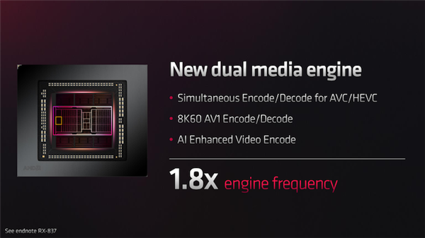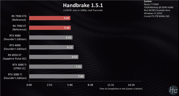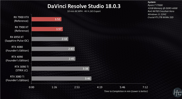 AMD的RX 7900系列显卡昨晚解禁了,各种评测都上了,大家对RX 7900 XT及RX 7900 XTX的游戏性能已经有底了,这方面追赶RTX 4090、RTX 4080还有点难度,尤其是光追游戏。 不过AMD也不是在所有方面都要弱,如果用户还要考虑显卡的生产力,特别是视频剪辑能力,那么RX 7900 XT/XTX显卡的表现还是有惊喜的。 Hardware Canucks网站对比AMD及NVIDIA两家四款旗舰卡的4K视频能力,分别使用了Davinci、Handbrake软件,一个是4K H265视频输出,一个是4K转码到1080p,时间越短越好。 在Davinici的4K视频输出测试中,RX 7900 XTX用时1分52秒,RX 7900 XT用时1分57秒,而RTX 4090用时2分45秒,RTX 4080也要2分43秒。 4K转码1080p的测试中,RX 7900 XT及RX 7900 XTX也是领先的,不过RTX 4080、RTX 4090的差距并不算多大。 至于在视频生产力上的进步,还要归功于RX 7000系列这次新设计的媒体单元,用上了新的双媒体引擎,可以同时编码/解码AVC/HEVC视频,同时新增了AV1编码的硬件加速。 此外,媒体单元支持AI强化,引入了AMD收购的赛灵思公司的机器学习技术,可以提升低分辨率及比特流的质量。 RX 7900系列显卡的媒体引擎频率也提升了80%,性能更强。 AMD之前重点提到的还是AV1编码能力,使用FFmpeg进行8K AV1转码,性能比软件提升7倍,后面等有了AV1测试再来看结果。 |