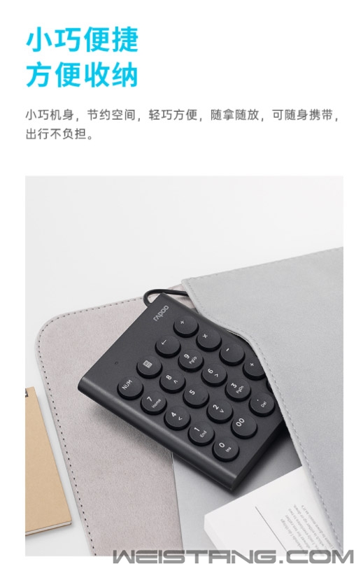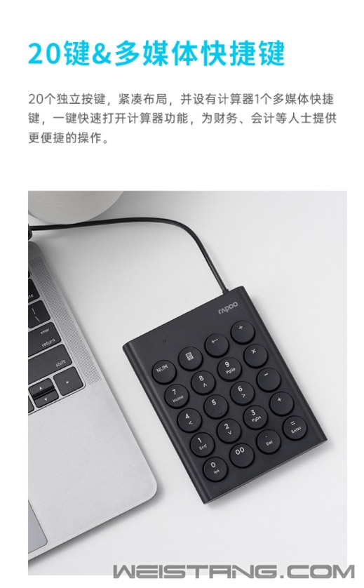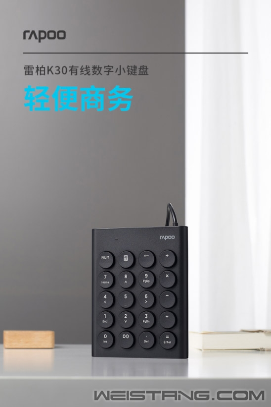 一份舒适的轻巧,一份效率的便捷,兼顾实用性+便利性的雷柏K30有线数字小键盘,小巧便捷,即插即用,20个独立按键,专为小尺寸配列键盘用户、财务、会计等人群而来,接下来让我们一起来详细看看 吧。 K30适用于笔记本电脑、财务、会计、资料员等人士使用,助力高效办公。 键帽字体印刷采用镭雕技术,不易褪色,耐磨耐用,配合层层筛选而出的高品质硅胶,恰到好处的敲击手感与回弹力度,带来更为轻松愉快的输入体验。 键盘共20个独立按键,紧凑布局,设有1个计算器多媒体快捷键,一键打开,为财务、会计等人士提供更便捷的操作。 整体机身小巧便携,节约空间的同时轻巧方便,出行不负担。 底部设有的四块大型防滑脚垫,均匀受力,确保稳固操作的同时,无需安装任何软件,连接电脑USB实现即插即用,悉心的设计省时省心。 |