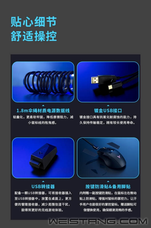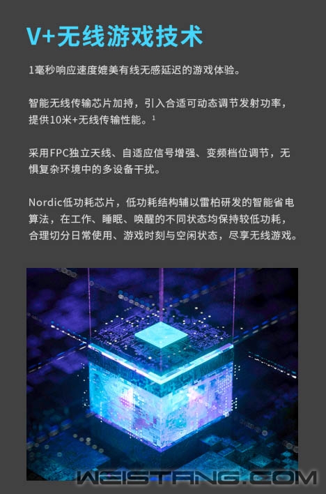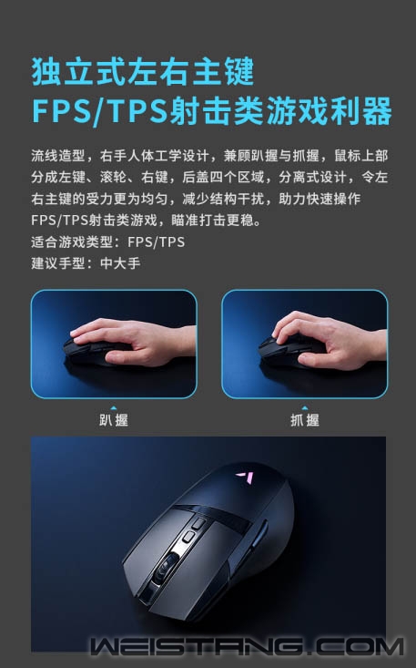 一只满足驰骋射击战场的玩家而来的性能野兽,雷柏V+无线游戏技术、原相3370电竞光学引擎、至高续航160小时,11个按键可自由编程。雷柏VT350S有线无线双模RGB游戏鼠标,性能续航拉满的同时展现出高超的性价比,接下来让我们一起看看。 VT350S采用流线造型,右手人体工学设计,兼顾趴握与抓握,鼠标上端分为左键、滚轮、右键,后盖四个区域,分离式设计,令左右主键的受力更为均匀,减少结构干扰,助力快速操作FPS/TPS射击类游戏,瞄准打击更加稳。 雷柏V+无线游戏技术的加持,1毫秒的响应速度,媲美有线无感的延迟体验。智能无线传输芯片的加持,提供10米+的无线传输性能。采用FPC独立天线,自适应信号增强,变频档位调节,无惧复杂环境中的多设备干扰。Nordic的低功耗芯片,辅以智能的省电算法,合理切分日常使用、游戏时刻与空闲状态,尽享无线游戏。 新升级的低功耗无线技术,在800毫安时的锂电池下给鼠标带来了至高160小时的长续航使用体验。USB-C连接充电的接口,3小时即可充满电量,开启超长的无线游戏体验。 采用了原相3370电竞级光学游戏引擎,准确定位每一帧,预设800/1200/1600/2400/3200/6400/19000,7档可循环切换DPI。 内置5000万次欧姆龙微动开关,持久耐用,手感爽脆,回弹迅速,电竞型50万次刻度滚轮,疾速响应防误触,不在为鼠标寿命而担心。 VT350S的特氟龙脚垫,为鼠标带来低摩擦、耐磨、快速顺滑的操作移动,瞄准操作几乎不受阻力影响。 后壳处带有5种灯效的品牌背光灯,可通过驱动自定义调节约1680万色彩。 鼠标左右侧裙采用磨砂工艺,具备透气排汗效果,提供防滑性能;内凹左侧面、宽大的左侧翼,为大拇指 提供良好承托。底部设有磁吸USB接收器收纳仓,不使用时可将接收器放置回去,以防丢失。 VT350S共有11键可编程,通过DPI+键+前进键即可切换模式,雷柏也为其配备了功能强大的专属驱动软件,可以完成对鼠标几乎所有的设置如DPI、灯光、宏、云同步等操作,化繁为简,开启智慧游戏新时代。 VT350S在细节方面也是做到了更贴心的装备,给予玩家更舒适的操控选择。1.8m伞绳材质的电源数据线,镀金的USB接口,背光型的USB转接器,按键防滑贴&备用脚贴的加入,种种的细节让玩家得到更完美的游戏体验,你值得拥有。 |