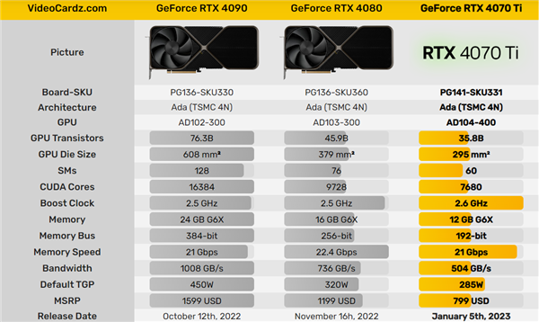 NVIDIA已经宣布,将于北京时间1月4日0点举办新品发布会。按照规划,届时将推出大家期待已久的RTX 4070 Ti。 距离发布只剩三天,外媒VC抢先曝光了RTX 4070 Ti的3DMark跑分成绩。综合来看,RTX 4070 Ti比RTX 4080慢了20%-30%,相比上一代RTX 3070 Ti快32%-39%,基本符合预期。 和对手相比,RTX 4070 Ti的综合性能不如RX 7900 XT。但在Speed Way和Port Royal两项光追基准测试中,RTX 4070 Ti更有优势。 以下为RTX 4070 Ti与其它型号的3DMark性能对比: 众所周知,RTX 4070 Ti就是之前取消的RTX 4080 12GB改了个名字,核心规格方面没有任何不同——7680个CUDA核心、2.6GHz加速频率、12GB GDDR6X显存,192-bit位宽,TDP 285W。 据最新消息,RTX 4070 Ti官方定价预计为799美元,中国区售价6499元,只有非公版。 |