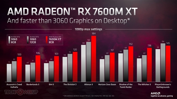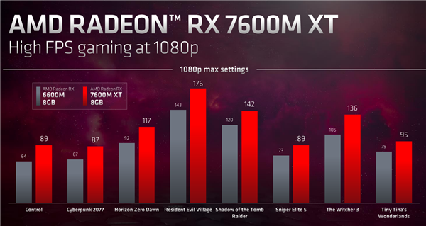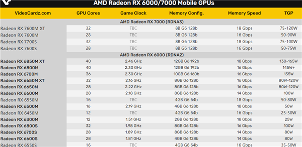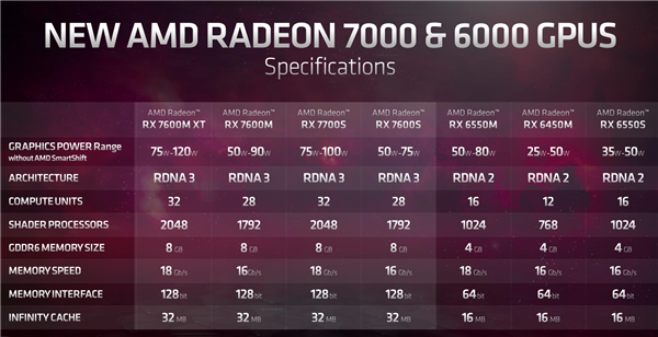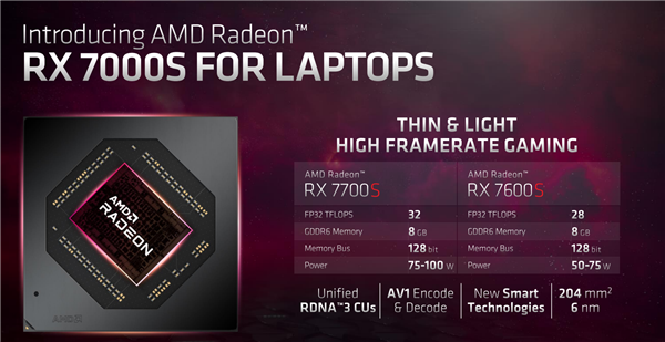 NVIDIA RTX 40系列进入了游戏本,AMD RX 7000系列也来了,成为锐龙7000系列移动版的搭档,不过这次非常特殊。 RX 7000系列移动版也是最新的RDNA 3架构,当然不会用顶级的Navi 31大核心,很可能是主流的Navi 32,而且也不是GCD、MCD的小芯片组合,而是单个芯片。 制造工艺并非最新的5nm,而是使用了6nm,核心面积为204平方毫米。 具体型号少了很多,只有四款,分为面向高端游戏本的两款M系列、面向轻薄游戏本的两款S系列。 M系列是RX 7600M XT、RX 7600M,分别32个、28个计算单元,也就是2048个、1792个流处理器,均集成32MB无限缓存,FP32单精度浮点性能分别32TFlops、28TFlops。 显存都是128-bit 8GB GDDR6,等效频率分别18GHz、16GHz。 功耗方面,RX 7600M XT可以设定在75-120W范围,RX 7600M则是50-90W。 主打1080p游戏,性能对比上代RX 6600M提升大约20-40%,同时可以基本完胜RTX 3060 12GB,领先幅度最高达惊人的38%。 S系列是RX 7700S、RX 7600S,核心规格分别对应RX 7600M XT、RX 7600M。 但是频率肯定有所降低,因为功耗分别降到了75-100W、50-75W。 性能方面,1080p分辨率下,RX 7700S对比上代RX 6700S,可以提升大约15-40%。 技术层面,除了继续支持SmartShift、SmartAccess等智能技术,还新增了两种玩法。 一是SmartShift RSR,RSR超分辨率技术的移动版,同样可以缩放画面、提高帧率,今年上半年落地。 目前,支持AMD FSR技术的游戏已经达到230款。 二是HYPR-RX,同样来到了移动端,同样可以一键开启·Anti-Lag抗延迟、Radeon Boost加速、RSR超分辨率三大技术,释放额外性能,今年上半年落地。 产品方面,外星人M18/M16、亿道(Emdoor) APX970/AG958P、英众科技(IP3) ARN37A都会搭载RX 7600M XT,华硕TUF GAMING A16则选择了RX 7700S。 它们都同时使用锐龙7000系列处理器,隶属于AMD超威卓越移动平台(AMD Advantage),支持FreeSync Premium和一系列AMD Smart智能调节技术。 |