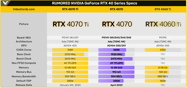 笼罩着矿卡阴霾,RTX 30系即便降价,也不受待见。可虽说更新的RTX 40系列桌面卡,售价已经下探到6499元(4070 Ti),但对于预算有限的朋友,仍旧是一笔不小开支。 好消息是,RTX 4070即将拍马赶到。 MEGAsizeGPU提前晒出了RTX 4070“大心脏”AD104-250 GPU的高清照,从顶盖文字来看为QS版,也就是准正式版。 另外,据说RTX 4070还会有AD104-251 GPU,区别在于少了电压比对器,功能不影响。 外界得到的消息是,RTX 4070会在两个月之内完成上市,最快3月最晚4月,价格预计5500元左右。 规格方面,集成5888个CUDA核心,相比于RTX 4070 Ti又少了1792个,而显存规格维持不变,还是192-bit 12GB GDDR6X,带宽504GB/s,整卡功耗降至约200W。 至于更入门的RTX 4060 Ti、4060桌面卡,恐怕还需要一段时间等待。 苦守着RX 7900 XT/XTX两张卡,布局更完善的RTX 40系可能会让AMD更无招架之力。 |