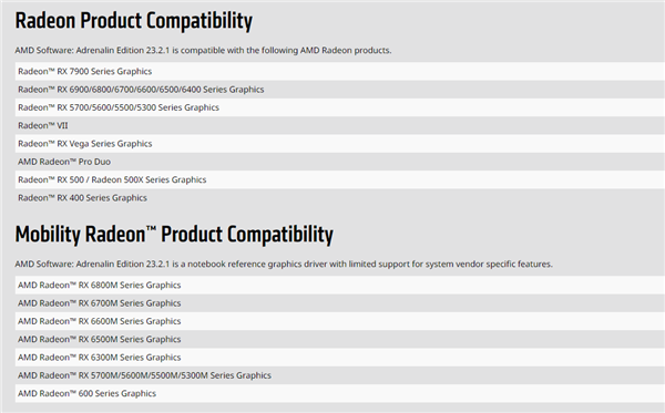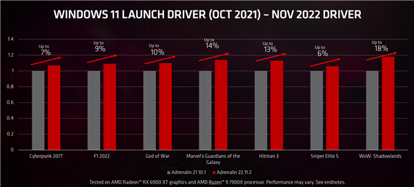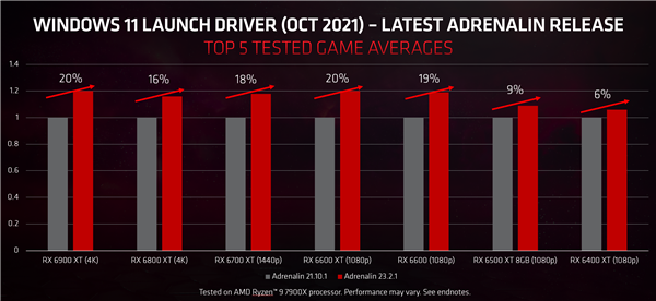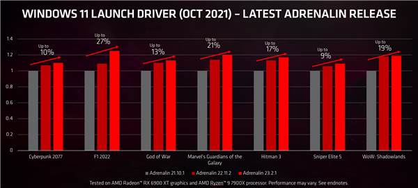 RX 7000系列显卡发布之后,AMD驱动部门一直忙于新卡的优化,RX 6000和更老显卡的驱动一直停留在去年12月初。 现在,AMD终于兑现承诺,最新发布的Adrenalin 23.2.1版驱动完整支持RX 7000、RX 6000等产品,最早可以追溯到RX 400系列。 新驱动正式支持《魔咒之地》(Forspoken),RX 6950 XT 4K分辨率下的性能比旧驱动提升7%,同时正式支持《死亡空间》(Dead Space)。 大家最关心的游戏提升方面,AMD这次提供了大量的数据。 RX 6950 XT 4K分辨率下对比22.11.2版本,《F1 2022》、《毁灭战士:永恒》、《雷神之锤II RTX》、《古墓丽影:暗影》、《银河护卫队》、《蜘蛛侠重制版》、《杀手3》、《无主之地3》、《狙击精英5》分别提升最多19%、9%、7%、6%、6%、4%、4%、4%、3%。 RX 6950 XT、RX 7900 XTX 4K分辨率下在《霍格沃茨之遗》中提升最多4%。 AMD还对比了新驱动在不同游戏、不同显卡上,对比21.10.1(Win11首发)、22.11.2的性能提升幅度,最多达到了27%——果然是战未来啊…… 其他功能特性方面,新驱动支持Vulkan MLIR接口的IREE编译器,支持更多的Vulkan扩展。 RX 6000系列也支持了RX 7900系列上新增加的预过滤器(pre-filter)、预分析(pre-analysis)、CAML等串流直播功能,支持H.264、H.265编码格式来。 最后就是修复了11个Bug,其中部分包括: - Win11 22H2上启动驱动时报错“Delayed Write Failed” - 《SpaceEngine》性能偏低,载入时间偏长 - RX 6000显卡在Steam上滑动查看时画面错误 - 《破门而入2》(Door Kickers 2)画面错误或崩溃 - 《急难先锋4》纹理丢失或闪烁 - RX 7000系列以Vulkan模式启动《博德之门3》时崩溃 - RX 6000/7000系列在《盗贼之海》中出现卡顿 - RX 6000/7000系列在《战地4》中设置后期处理高质量时画面错误 - RX 7000系列在《霍格沃茨之遗》中出现白色树叶 - 多屏系统使用Chromium核心浏览器同时播放两部视频时出现间歇性系统卡顿后界面闪烁 |