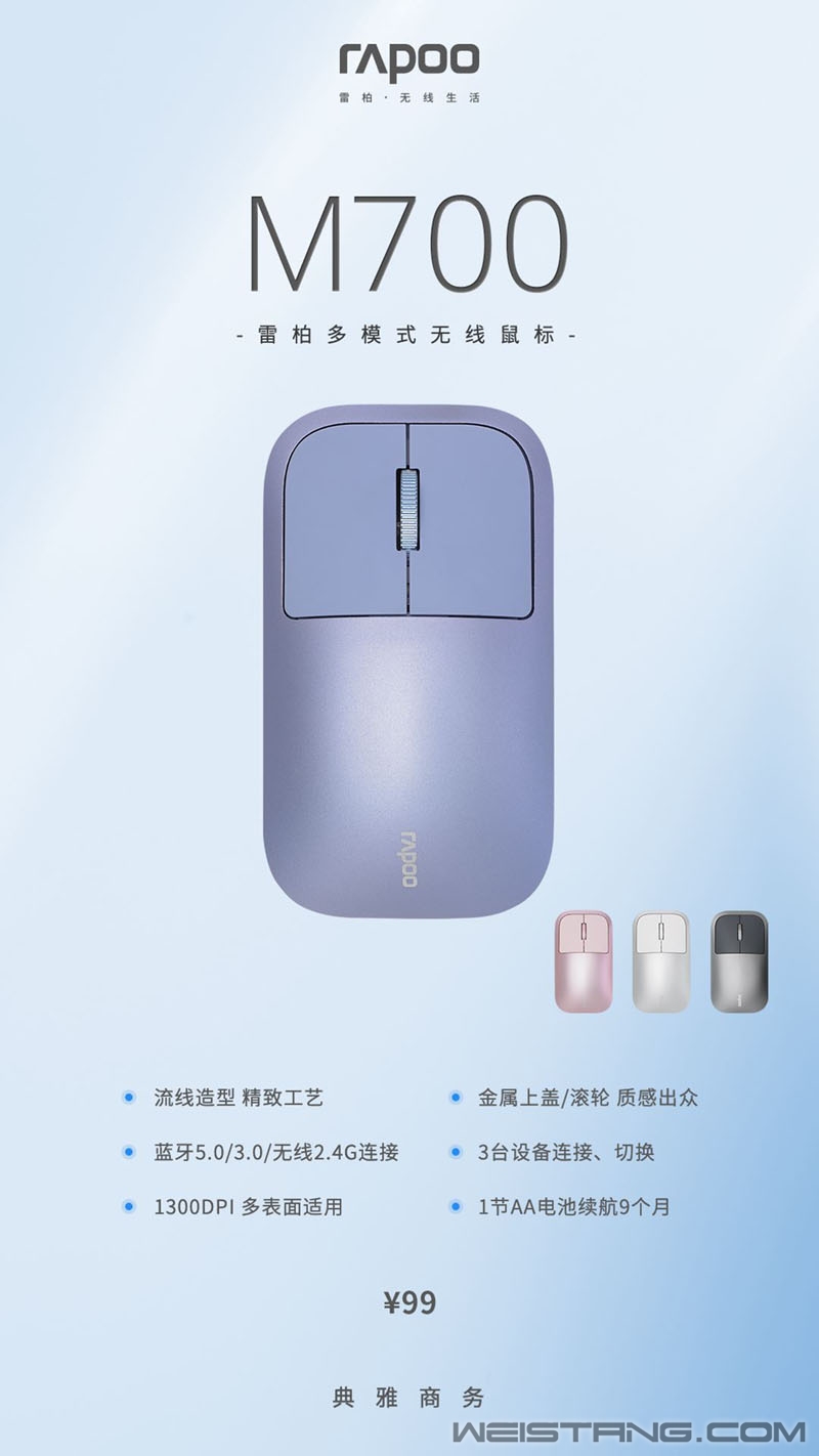 无论是新人小白还是职场精英,办公场景不再框定于室内,简约舒适“一身轻”的职场装备成为了他们高效办公的选择。雷柏无线办公系列键鼠通过颜值、色彩、工艺设计等方面,为都市生活注入一些“轻巧”元素,解锁办公场景的无限可能。 #无惧出行系列# 时尚并行,轻巧陪伴 时尚实用,移动通勤搭配新公式。E9050G多模无线键盘78键紧凑型布局设计、最薄处仅为5mm的轻薄机身,搭配造型设计温润萌新、握感软弹舒适的M650多模无线鼠标,轻松解锁多种携带方式,移动办公更尽兴。但出行没色彩怎么型?色彩的丰富度不仅能让日常移动办公拥有焕然一新的视觉,更能触发我们的工作热情。E9050G&M650在色彩丰富度上做了功夫,四种色彩搭配一秒带出活力感,轻巧减龄不在话下。 轻巧陪伴,长效待机。除了便携性,一机多模连接,蓝牙5.0、3.0和无线2.4G,快速连接平板、手机、笔记本等设备,时髦优雅随时切换。E9050G多模无线键盘内置300mAh可充电锂电池,使用USB-C接口,2小时充电可供约60-96小时续航。M650多模无线鼠标仅需1节AA电池,续航时长越大9个月。好搭配又实用,是都市人对生产力工具的所有诉求,也更贴合现下快节奏的生活方式。 #弹性自由系列# 舒适自在,松弛治愈 快节奏的生活下,都市职场人都在追寻自由与松弛,转换思路,回归简约又不失质感的基点,轻巧的前提也应当是舒适。99键带数字键盘的E9350多模无线键盘,方便生产力。圆形内凹的键帽设计更贴合指腹,搭配剪刀脚结构,触感更轻盈。与E050G同样轻薄的机身,也为桌面节省了不少空间。结合舒适掌握恰到好处的M700多模式无线鼠标,轻松演绎职场力MAX。M700上盖整面金属一体冲压成型,中小手或差旅用户尤为适用,13000DPI高精度寻迹引擎,定位准确,适配不同材质表面使用,灵动处理工作事务。 多款配色灵感,紫粉银黑,通勤搭配一套速成,更是一种随行自如。E9350G&M700是经得起场景考验的,既能驾驭多种场合,兼具Windows和Mac OS双系统,支持蓝牙5.0、3.0和无线2.4G三种智能连接模式,可快速连接切换多台终端设备,为职场办公带来了更多的可能性。 舒适轻巧,多色搭配,雷柏无线办公系列键鼠,以无线性能带我们体验轻巧办公,以色彩美学为我们的都市生活添一些艺术性。 |