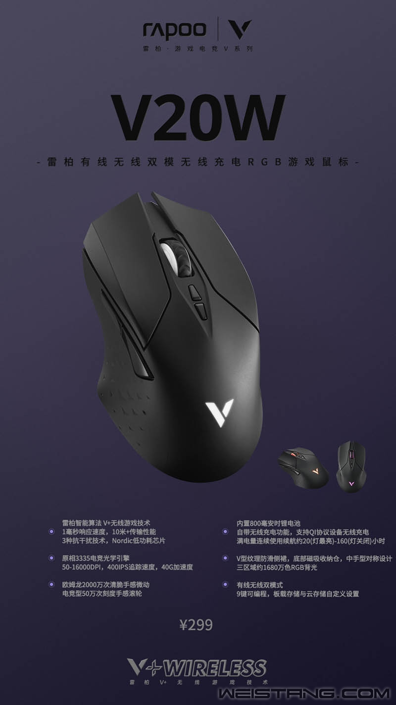 V+无线游戏技术,原相3335游戏光学引擎,续航至高160小时,带无线充电功能,支持QI无线充电协议,强劲敏捷的犀利线条,这些特点加持在一款曾承载无数玩家游戏梦想的明星产品,会重现什么? 雷柏V20W顺应无线化世代发展需求,对经典造型进行复刻,它不仅是经典的重现,同时也是经典的新生。全新的外观升级和原相3335电竞明星引擎,欧姆龙2000万次清脆手感微动,电竞型50万次手感刻度,50-16000 DPI,400IPS追踪速度,40G加速度,9键可编程,让它更加符合超级玩家的审美和性能需求,雷柏V20W有线无线双模无线充电RGB游戏鼠标,一款复刻经典设计的无线化高性能产品,299全新登场! 经典造型,重获新生 雷柏V20W继承自雷柏自主设计ID基因编码,127毫米的鼠标长度搭配左右对称人体工程学设计,专为中大手型玩家设计,自然的机身弧度曲线使得V20W不论是趴握、抓握、捏握都能得到更好的支撑感和贴合度。 梦想的棱角,永远犀利。速度感是全新升级的V20W的核心关键词,MOBA竞技理念与犀利曲线致敬经典明星款,凌锐锋芒的左右键线条、粗纹厚底橡胶滚轮、菱形防滑凹点侧裙设计,V型速度底座脚垫,V20W的每个细节无一不在宣告它的迅捷。 在流淌V20S基因的基础上,如何加速度?创新分离式鹰翼造型左右按键设计,减少结构干扰,只为实现更加迅捷的操作反馈,搭配专为MOBA类游戏调校的欧姆龙2000万次微动,将速度感贯彻其中,手感清脆利落,反馈迅捷灵敏。 电竞型50万次刻度滚轮,粗纹厚底橡胶增强刻度触感,在滑动中感受刻度精准定位的反馈;左右侧裙沿用V型速度感纹理工艺,搭载对称式指托,是速度的加持,也是稳定的保证;底盘上下搭载大V特氟龙脚垫,加持鼠标迅捷顺滑操作,稳定不失速度。 当经典的造型,碰上前沿游戏科技,会新生什么? 技术普及标杆,“V+无线游戏技术”在V20W上发挥充沛的游戏潜能,媲美有线鼠标1毫秒的响应速度;加持智能无线传输芯片,引入合适可动态调节发射功率,提供10米+无线传输距离;采用FPC独立天线、自适应信号增强、变频档位调节三重技术抗干扰;Nordic低功耗芯片+雷柏自主研发智能省电算法+800毫安时可循环充电锂电池,续航时长至高可达160小时,蓄能澎湃,持久畅玩;有线充电采用USB-C极速充电口,充满电仅需3个小时。 充电普及标杆,内置无线充电模块,适配市面上兼容QI标准的无线充电底座与无线充电鼠标垫,即放即冲,迅捷蓄能,无限驰骋,更高效、更人性化的充电方式让竞技体验化繁为简。 当经典的造型,碰上顶级游戏硬件,会新生什么? 如何去赋予一款经典明星产品新的价值,雷柏V20W采用原相3335电竞光学引擎,50-16000DPI,支持以50为单位逐级调节,预设7档DPI循环切换,迅猛出击亦是沉着发育,一键到位;400IPS追踪速度,40G加速度,1000Hz回报率,实时捕捉每一个游戏中的细微操作。V20W装载1680万色彩RGB背光灯,五种灯效在滚轮、Logo、尾部同时绽放,张扬的流光映衬在经典的造型上,更加符合复刻经典的意境和主题。 更有官方自主软件驱动,9个可编程按键,把控更加自由的游戏赛场,智能云存储保存多组配置文件,支持开启多种扩展功能。 装备搭载,整装出击,底部磁吸收纳仓,有效避免接收器丢失;同时配套替换脚贴、按键防滑贴、1.8m伞绳材质电源数据线、镀金USB接口、USB转接器,让每一次出击更加后备无忧,让电竞享受更加畅爽。 雷柏V20W经典复刻加入雷柏无线外设全家桶矩阵,以速度作为核心概念贯彻性能,性能进化尽展中大手运动精髓,以“V+无限游戏技术”加持性能,以无线技能作为尖点性能,雷柏V20W有线无线双模无线充电RGB游戏鼠标,满配出装! |