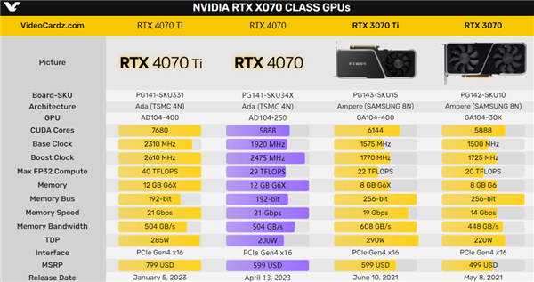 NVIDIA RTX 40系列的第四名成员,RTX 4070将于4月12-13日正式登场,其中12日解禁公版和基础版,13日解禁高配版并开卖。 价格方面,海外定在599美元起步,和上一代的RTX 3070 Ti保持一致,对比RTX 3070则上涨了100美元。 据快科技独家获悉,RTX 4070的国行版建议零售价为4799元起步,比此前很多人预期的4499元略贵一些。 作为对比,RTX 3070首发价3899元起,RTX 3070 Ti首发价4499元起,这一代又涨了,而高配版肯定奔着5000元左右起步去了。 新一代此前三款型号的首发价分别为:RTX 4090 12999元起、RTX 4080 9499元起、RTX 4070 Ti 6499元起。 RTX 4070 Ti RTX 4070的规格已经基本没有秘密: AD104-250/251 GPU核心,5888个CUDA核心,36MB缓存,基准频率1920MHz,加速频率2475MHz,显存位宽192-bit、容量12GB GDDR6X、带宽504GB/s,整卡TGP 200W。 根据官方披露数据,平均游戏功耗为186W,视频播放功耗16W,待机功耗10W。 消息称,RTX 4070基础版采用传统PCIe 8针供电,超频高配版解锁到TGP 220W,使用12VHPWR 16针供电。 |