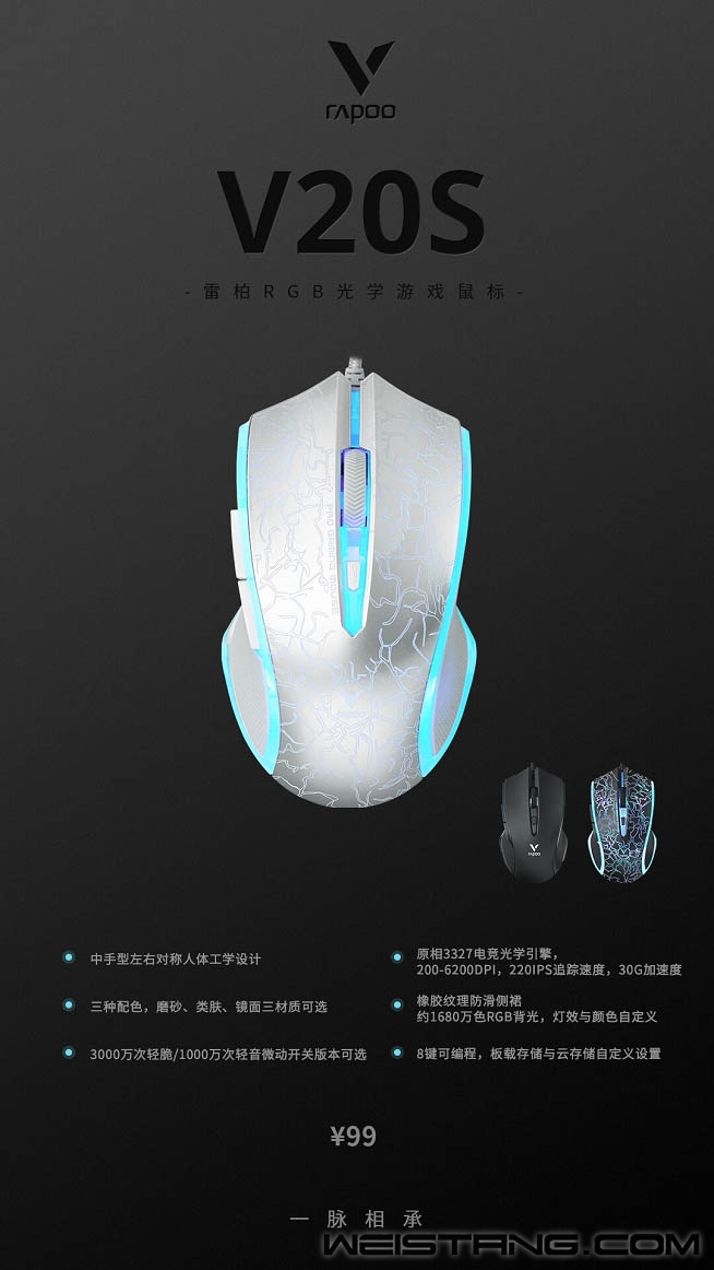 雷柏游戏V系列,中手型经典ID V20S 光学RGB游戏鼠标,全新升级,2023版展现更多元、更个性化设计。 在专业的领域与功能性、外观的追求创造不同差异化,升级微动,3000万次轻脆/1000万次轻音微动开关;升级引擎,原相3327电竞传感引擎、8键可编程板载内存;继承1680万色RGB背光系统的同时,更显用料质感,精调皮肤,三种配色,三种不同触感。对于精准度的全面考量,对不同视觉、触感玩家个性需求的满足。雷柏V20S RGB光学游戏鼠标2023版,中手型手感,99元推出。 给造型色卡充能RGB点亮氛围,不怒自威的“黑色烈焰”;优雅静谧的“白色烈焰”;纯简形态“黑色”,入目可及的战力注入桌面,约1680万色RGB背光系统,6种模式,可自定义调节,点燃竞技氛围,转瞬即逝,烈焰迸发,战局一触即战! 给手感舒适一个答卷:锐利线条与柔和曲线的勾勒,左右大面积橡胶材质侧裙,左右对称的设计语言,诠释中手型手感的先天属性,兼顾抓握、趴握,将手感基因技能点MAX。 给不同触感多一种选择:黑色款上盖采用磨砂表面处理工艺,带来一份细腻温和的使用触感。黑色烈焰款上盖采用类肤表面处理工艺,搭配镭雕烈焰纹理,防滑防汗手感更具附着力;白色烈焰款上盖采用高光镜面表面处理工艺,手感相当细腻、平滑。以不同玩家手感需求为标杆,打破产品设计妥协的两难境地,对于不同手感/触感的想象延伸,多一些。 性能升级,确保手感:黑色/黑色烈焰/白色烈焰轻脆版微动,3000万次的使用寿命,触发迅速,回弹手感清脆,激烈团战、狭路刚枪,恰到好处的声音反馈。黑色款再添轻音版微动,1000万次使用寿命,夜深人静的宿舍、卧室等环境,有效减少使用噪音,给予他人一份宁静,给予自己一份竞技血统在线的游戏手感鼠标。 竞技血统校准,确保精准:原相3327电竞光学传感器,6200DPI,220IPS,30G,在50-6200 DPI之间,支持50为单位逐级调节,同时预设7档可循环DPI切换。性能参数的可视化,用更为简单高效的方式,表达性能对于操作的捕捉,一份属于V20S的英雄时刻,让强看得见。通过专属驱动,可自定义鼠标8个按键功能,灯光设置、宏设置;组合连造,一键设定,校准竞技血统,助力高光对局! 3327光学游戏鼠标、配套驱动软件、6种模式RGB灯光、纯粹中手型手感,三种不同触感选择,两种不同微动,以性能、个性、体验为设计语言,将一切表达具象呈现,解锁更多沉寂游戏的想象,雷柏V20S游戏鼠标,99元全新登场。 |