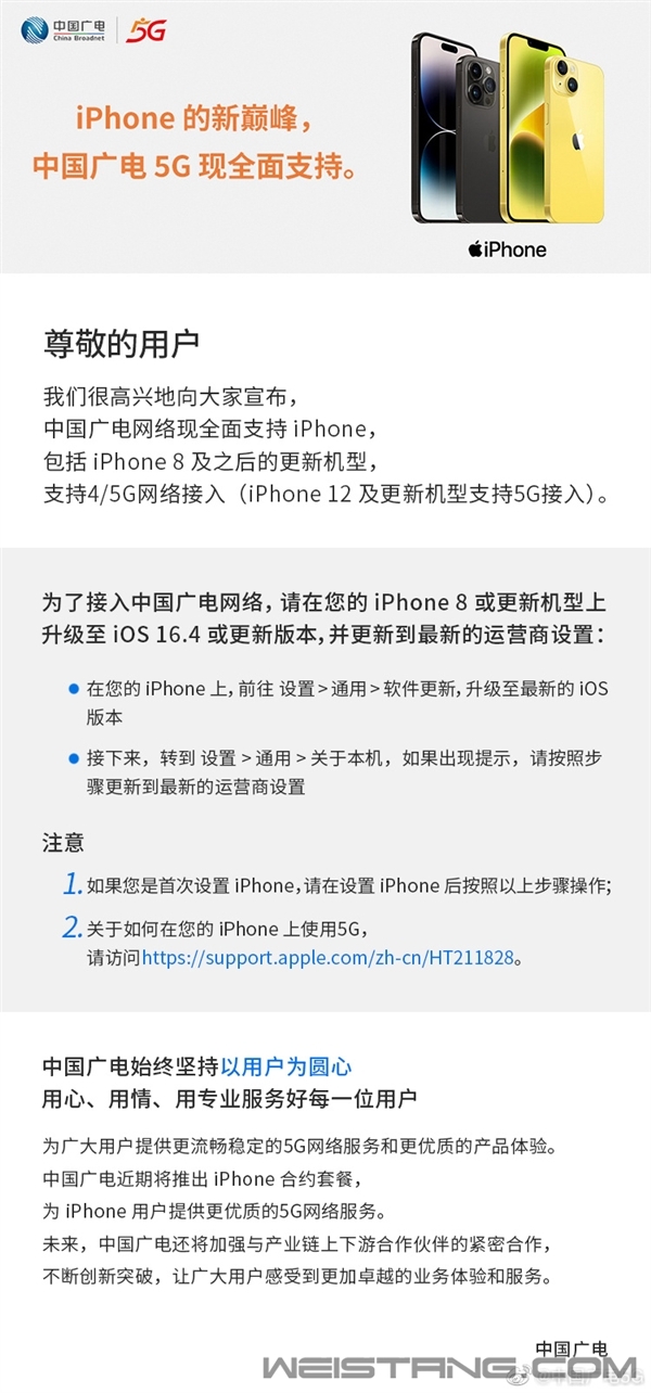 今早,中国广电官方发布消息宣布:中国广电5G现全面支持 iPhone。 据介绍,中国广电5G支持iPhone 8及之后的更新机型,支持4/5G网络接入(iPhone 12及更新机型支持5G接入)。 不过需要注意的是,老版本系统还是无法使用,如果有对应机型需要升级到iOS 16.4或更新版本。 此外还要更新到最新的运营商设置,具体操作如下: 在您的iPhone上,前往设置>通用>软件更新,升级至最新的iOS版本 接下来,转到设置>通用>关于本机,如果出现提示,请按照步骤更新到最新的运营商设置 根据用户SPEEDTEST网速测试,中国广电5G能跑到800Mbps以上的下载速度。 不过,5G对于iPhone的耗电确实不容忽视,身边很多朋友都选择长时间关闭5G,有需要再打开。 如果你也不想一直开着5G的话,可以在蜂窝网络设置中自行选择是否打开广电5G网络,也可以选择4G网络。 |