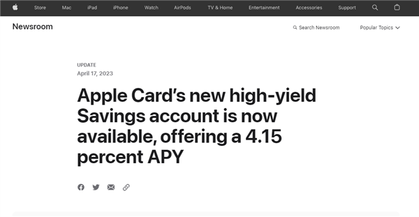 此前多次曝光的苹果版“余额宝”来了,苹果官网宣布,与高盛合作的Apple Card高收益储蓄账户(Savings Account)正式上线,功能有些类似我们熟悉的“余额宝”。 据了解,目前Apple Card提供4.15%的年利率,苹果称是美国平均水平的10倍以上。 用户通过Apple Card设置储蓄账户后,来自Apple Card的每日返现(Daily Cash)会自动存入该账户。 另外,用户还可通过一个关联的银行账户将资金存入储蓄账户,或将Apple Cash余额中存入储蓄账户的个人资金赚取利息,并且可以随时将资金转出到关联的银行账户,过程不收取任何费用。 据悉,Apple Card是苹果的信用卡服务,于2019年3月26日在苹果春季新品发布会上发布,Apple Card承诺免逾期费、免年费、免超限费、免跨境支付费。 |