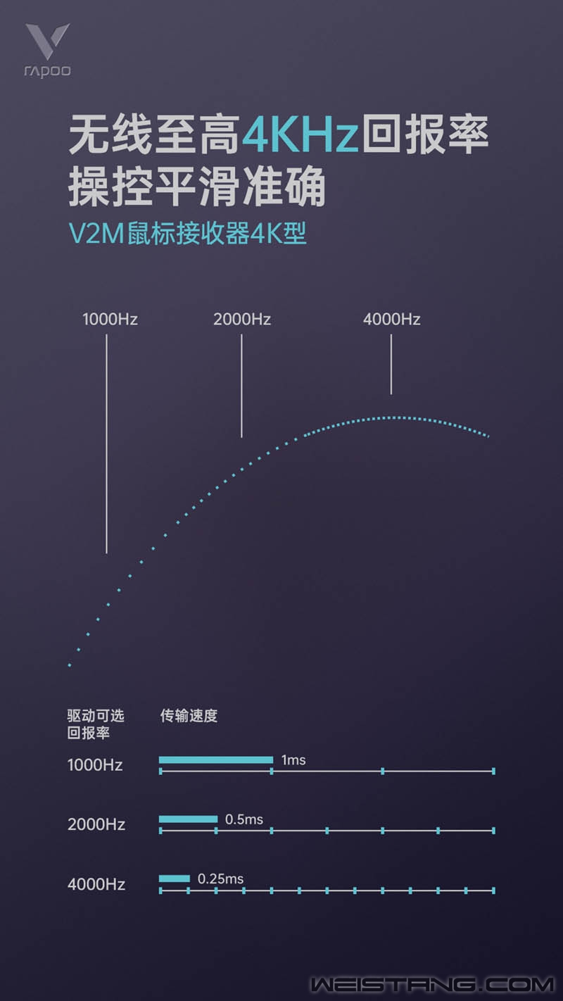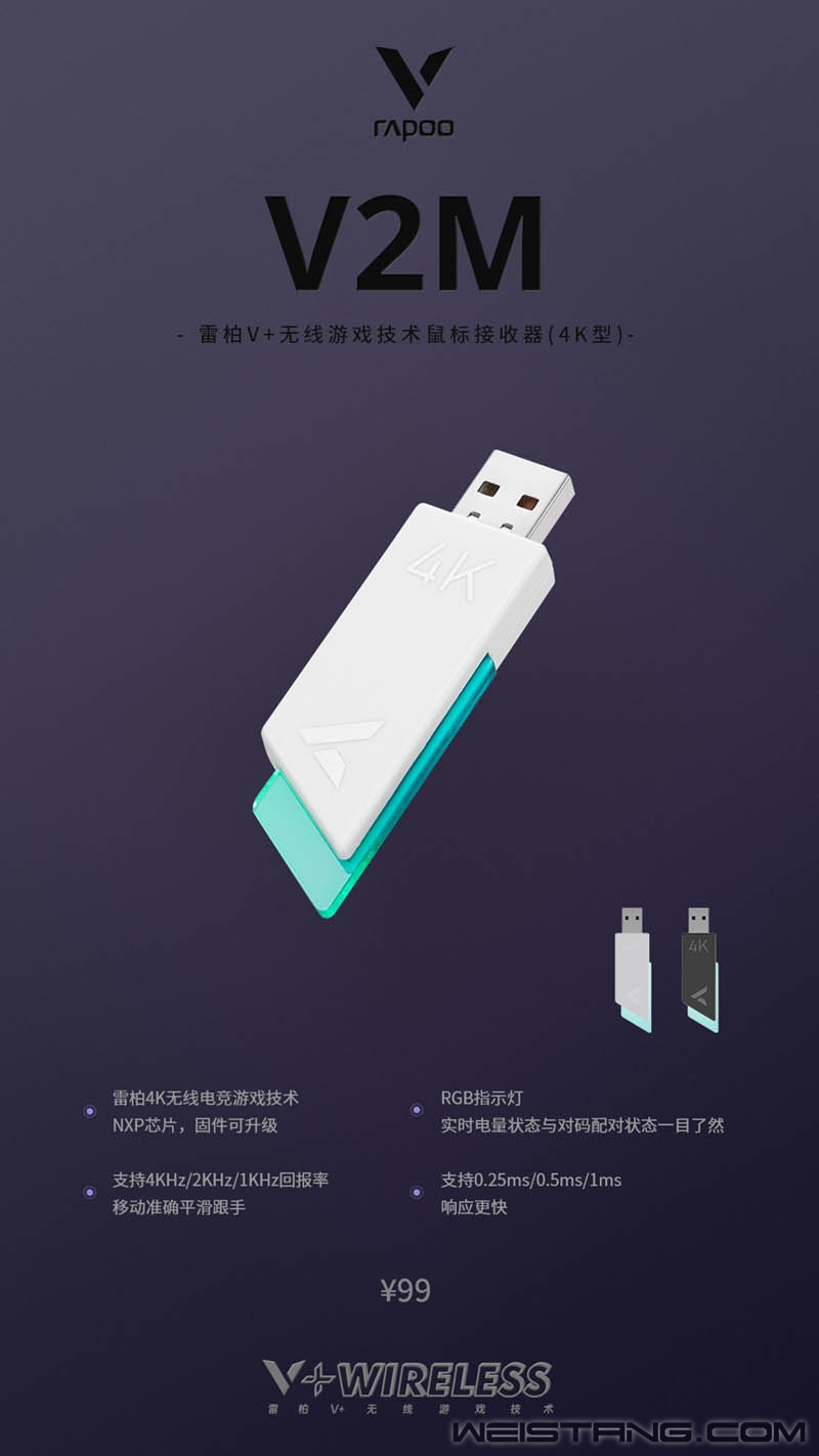雷柏外设普及核心技术“+”计划第四篇章--4K无线电竞游戏技术,以更加成熟的算法技术作为极致性能普及趋势答卷。 通过雷柏4K无线技术智能算法+NXP高性能硬件芯片构建,将无线游戏鼠标性能最大化提升,雷柏首款4K无线技术鼠标接收器——V2M发布!至高4000次每秒的回报率,响应速度低至0.25毫秒,RGB电量状态指示灯,对无线游戏操作场景的极致追求,提升跟手操作体验,提升光标顺滑追踪,提升光标稳定定位,提升光标灵敏感应,演绎品牌极致的无线专业属性与强大的功能特性。 硬核内芯,加持极致性能 对于每个游戏玩家而言,无线4K回报率意味着全方位性能越级体验,毫秒间的延迟优化能瞬间提升极致游戏玩家的操作反应,带来更强劲的游戏表现。雷柏V2M以玩家需求为基点,以电竞性能为落点,钻研无线4KHz技术,搭载NXP芯片,有效整合软硬件实力,充分发挥高端传感器性能,提升鼠标回报率。 高参数的数值是技术成熟程度的体现,V2M接收器支持通过雷柏无线游戏鼠标配套驱动软件支持固件可升级,建立强势的软实力充分发挥高端光学引擎SENSOR性能与实用价值。无线状态下提供了至高4KHz的回报率,相较于1KHz的回报率每秒发送的传输数据提升4倍,传输速度最高提升到0.25ms,响应更快,鼠标操控更平滑准确,满足无线极致玩家对电竞性能的追求。 软件算法实力是一个转换地带,通过驱动直接建立连接性,最大范围支持玩家游戏、显示器等设备的综合考量,雷柏4K无线游戏鼠标支持驱动软件支持4KHz、2KHz、1KHz三档回报率选择调整,分别支持0.25ms、0.5ms、1ms响应速度,方便玩家选择更适合的性能体验。 科技理念,加持性能体验 由外观开启性能篇章,小巧便携造型设计,让4K极致电竞体验随处实现;利落线条及刀锋设计是便携的精髓,展示连接状态与电量状态的尾部RGB指示灯,更是跳出接收器一体式结构,为玩家呈现更具全面的电竞美学,通过灯光与灯效结合展示接收器与鼠标连接状态、对码配对与对码成功状态,通过绿色黄色橙色红色的直观颜色,让无线游戏鼠标当前电量状态一目了然,消除玩家电量顾虑。 技术配合,加持续航体验 4K无线电竞游戏技术加持雷柏游戏V系列,搭配V+无线游戏技术,双能加持,充分发挥出4K技术的体验优势,以4KHz回报率提供灵敏反馈配合V+技术算法优化,一定程度上降低4K功耗,延长鼠标续航时长,满足游戏玩家畅快游戏体验! 瞬息万变的电竞战场,毫秒间的信息整合,片刻的延迟直接影响战局走向,这也是当今电竞选手对设备性能高要求的原因。雷柏V2M V+无线游戏技术鼠标接收器(4K型)以专业电竞玩家体验需求为导向,顺应无线游戏场景应用趋势,通过技术创新,打破传统技术屏障,最大程度发挥还原玩家高秀赛场操作,满足每一个追求极致的梦想追求。 备注: 1.接收器的4K性能对鼠标光学引擎有性能要求,需是原相3395、原相3399等相同级别或更高级别的雷柏V+ 无线游戏技术鼠标,包括雷柏VT9与后续上市官方公布支持4K的新品。 2.V2M首次连接使用,V+无线游戏鼠标需通过驱动进行对码使用,随后即可享受随插随用 3.相同条件下使用,不同的回报率下无线电竞游戏鼠标续航时长也不同,一般在2000Hz回报率下的续航约是1000Hz回报率的55%-60%,在4000Hz回报率下的续航约是1000Hz回报率的30%-35%。 |