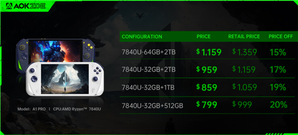 4月29日消息,今年的Windows掌机如雨后春笋一般涌现,前几天AMD甚至还推出了专为掌机设计的锐龙Z1系列处理器,华硕的ROG Ally会在下个月初首发,现在AOKZOE打造的A1 Pro掌机也开始众筹了,高配版价格上了8000元。 由于锐龙Z1系列有华硕的独占,AOKZOE A1 Pro掌机用的是锐龙7 7840U,架构应该是一样的,也是8核Zen4 CPU,3.3GHz到5.1Ghz频率,整合Radeon 780M核显,这也是当前最强的核显,12组CU单元,浮点性能可达8.6TFLOPS,逼近PS5的10TFLOPS性能。 其他还有LPDDR5-6400内存、PCIe 3.0 x4硬盘,规格很全面。 至于AOKZOE A1 Pro整机本身,除了锐龙处理器之外,还有8英寸的大屏,比ROG Ally的7寸还要大一些,设计及按钮布置这些就大同小异了。 AOKZOE A1 Pro将于4月30日开始众筹,有4个版本,价格不便宜,众筹优惠15-20%不等。 AOKZOE A1 Pro的32+512GB版售价999美元,众筹价799美元,约合5540元人民币,32+1TB版售价1059美元,众筹价859美元,约合5938元人民币,32+2TB版售价1159美元,众筹价959美元,约合6628元人民币。 顶配的是64+2TB版售价1359美元,众筹价1159美元,约合8011元人民币,比一台高端PC都要贵了。 这个价格也要比ROG Ally的16+512GB顶配700美元价格贵不少,不过后者的是锐龙Z1处理器,只有6核CPU及4组CU GPU单元。 |