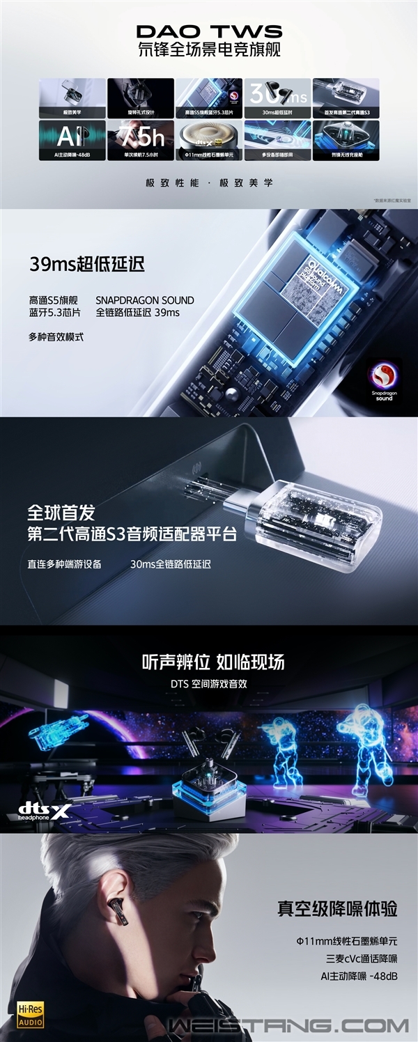 红魔今日下午正式举行了红魔电竞宇宙新品发布会,为大家带来全新的Dao TWS氘锋耳机,售价为1499元。 据介绍,这款耳机采用氘锋透明设计,可DIY穿戴配饰,并且配备氘锋无线充座舱,支持无线充电和旋钮调节模式。 声音上,Dao TWS氘锋内置11mm线性石墨烯单元,具有三麦克风CVC通话降噪,-48dB主动降噪,且通过Hi-Res认证音质。 硬件方面,新品搭载高通S5旗舰蓝牙5.3芯片以及全球首发的第二代高通S3音频适配器平台、DTS联调音效,30ms全链路超低延迟。 此外,新款耳机单次续航时长达7.5小时,配备氘锋无线充电舱,多设备即插即用。 |