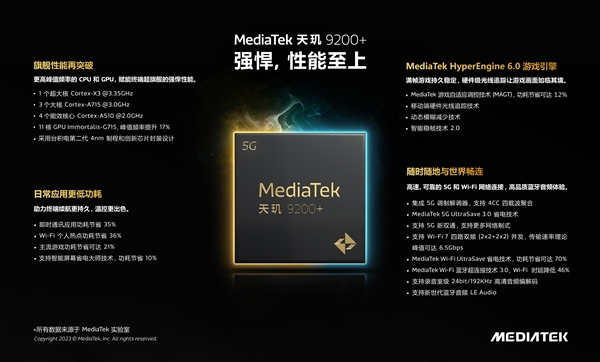 联发科今日发布全新旗舰SoC天玑9200+,iQOO Neo系列新品将全球首发,后续或还有ROG Phone 7 trim等,第二季度陆续上市。 关于这颗新U的两点,联发科整理了一张图看懂。 据悉,天玑9200+的CPU频率提升最高11%,最高3.35GHz;GPU频率提升17%,GFXBench跑分增加10%。 在性能更强的同时,功耗则更低。联发科称,即时通讯应用功耗节省35%、Wi-Fi热点功耗节省36%、主流游戏功耗节省21%、屏幕功耗节省10%。 游戏同样是此次优化的重点,自适应调控技术MAGT可使游戏功耗节省12%,满帧更稳定。 此外,连接方面,天玑9200+支持5G四载波聚合、5G新双筒、Wi-Fi7四路双频并发(6.5Gbps),Wi-Fi功耗节省70%、时延降低46%,支持录音室级24bit/96KHz高清音频编解码、蓝牙LE Audio等。 |