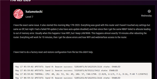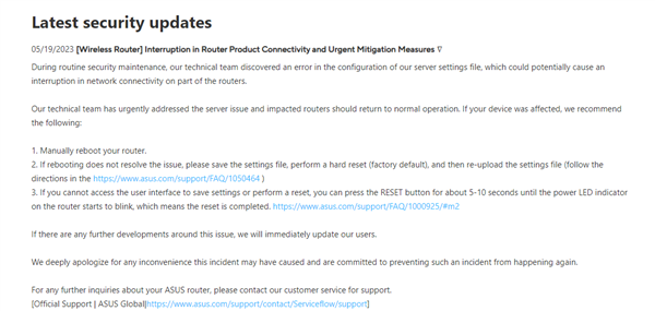 自本周三起,全球多地华硕路由器的用户反馈,他们的设备突然莫名其妙地死机,然后在反复重启后,每隔几分钟就会因为设备内存耗尽而停止工作。 据了解,华硕服务器推送了错误的固件,导致华硕路由器系统内存溢出。从而极大影响路由器性能,甚至出现断网的情况。这一问题从出现到被解决,大约历时48小时,引发用户不满。 在reddit论坛上,大量用户反馈了这一情况。“昨晚世界各地的华硕路由器开始崩溃。几十万的华硕路由器,华硕却没有发表任何声明。”有网友抱怨道。 “16日,华硕推送了一个损坏的ASD定义文件,ASD是一种内置安全守护程序,广泛存在于他们的路由器中,”一位用户写道。“随着路由器自动更新并获取损坏的定义文件,它们开始耗尽文件系统空间和内存导致崩溃。” 5月19日,华硕官方在最新的安全更新页面中进行了回应,并公开道歉。 “在例行的安全维护中,我们的技术团队发现我们服务器设置文件的配置存在错误,这可能会导致部分路由器的网络连接中断。” 华硕表示,我们的技术团队已紧急解决服务器问题,受影响的路由器应恢复正常运行。如果您的设备受到影响,我们建议您执行以下操作: 1、手动重启路由器。 2、如果重启无法解决问题,请保存设置文件,执行硬重置(出厂默认设置),然后重新上传设置文件(按照 https://www.asus.com/support/FAQ/1050464 中的说明进行操作) 3、如果无法访问用户界面保存设置或执行重置,您可以按住RESET按钮约5-10秒,直到路由器上的电源LED指示灯开始闪烁,这意味着重置完成了。https://www.asus.com/support/FAQ/1000925/#m2 如果围绕此问题有任何进一步的发展,我们将立即通知我们的用户。 对于此次事件可能造成的任何不便,我们深表歉意,并致力于防止此类事件再次发生。 |