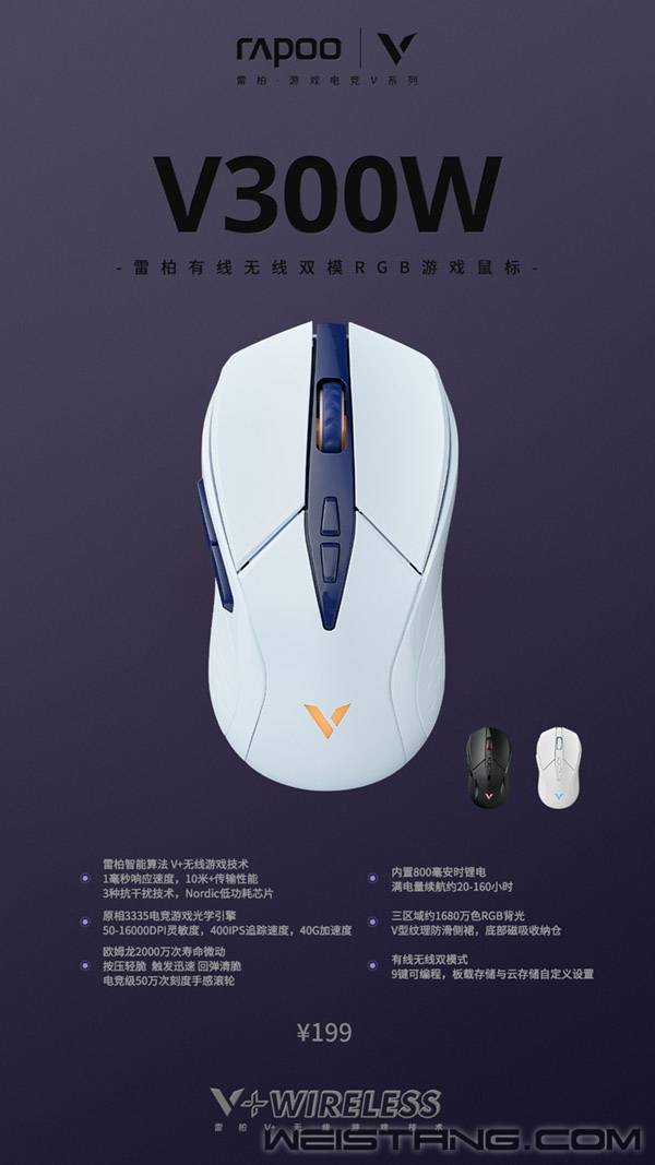 雷柏V300W双模无线游戏鼠标,专属造型、性能调校,专为中小手型玩家打造的MOBA类超强利器! 既有锋芒,亦有柔光,锐意线条印刻在88克的鼠标流线躯体中,滚轮、Logo、尾部五种灯效同时绽放1680万色彩RGB背光灯,如同毒蛇缠绕,绚丽视觉中埋藏着致命威胁;UV涂层、镜面、磨砂3种材质同时呈现,搭配左右对称人体工程学,打造视觉与手感的巧妙平衡,支持趴握、抓握、捏握三种不同贴合手型握姿。 怒海威蓝:翻腾怒吼的海洋,巨浪捍卫着不可接近的领域,激涌冲撞之间,总有勇士化身一抹威蓝斩破巨浪,激流而行。 星穹白霜:星穹之上,势如彍弩,霎那间,白霜迸发,星尘陨落,洁白且美丽的表象之下,隐藏着压倒性的破坏力。 黑兽之威,潜伏在草丛的暗影正在蓄势待发,静寂的暗涌是危险的信号,嘘,别被这份宁静欺骗了,待到猛兽扑袭之刻,方知黑兽之威。 硬核Buff成就峡谷猎手,雷柏V+无线游戏技术,1毫秒低延迟、10米+远距离操作、FPC独立天线、自适应信号增强、变频档位调节3重技术抗干扰,瞬息战场中的即刻反应即刻表现! 左右主键分离设计,轻松享受MOBA类快速点击操作,欧姆龙2000万次微动手感支撑,根据MOBA类游戏调校,快速连点手感清脆利落,电竞型50万次刻度滚轮,响应稳定更加精准。 狭窄的战局,精准的微操,将决定战局的主导权,原相3335游戏光学引擎,以“精准之芯”调校,50-16000DPI,400IPS追踪速度,40G加速度,1000Hz回报率,加持无线操作的准确分析,果断判断和专业反应。 硬核续航助长操作,Nordic低功耗芯片+雷柏自主研发智能省电算法,800毫安时可循环充电锂电池,至高续航达160小时,打破时间枷锁,释放持久猛兽!9个可编程按键,配备专属驱动,可保存多组配置文件,开启云分享功能。 底盘搭载四张特氟龙脚垫,保证多方向稳定操作,底部磁吸收纳仓,有效避免接收器丢失;同时配套提供替换脚贴、按键防滑贴、1.8m伞绳材质电源数据线、镀金USB接口、USB转接器,细节的雕琢成就精准的微操。 点开视频,开启V+无线游戏技术之旅,感受来自微操硬实力的压迫感! |