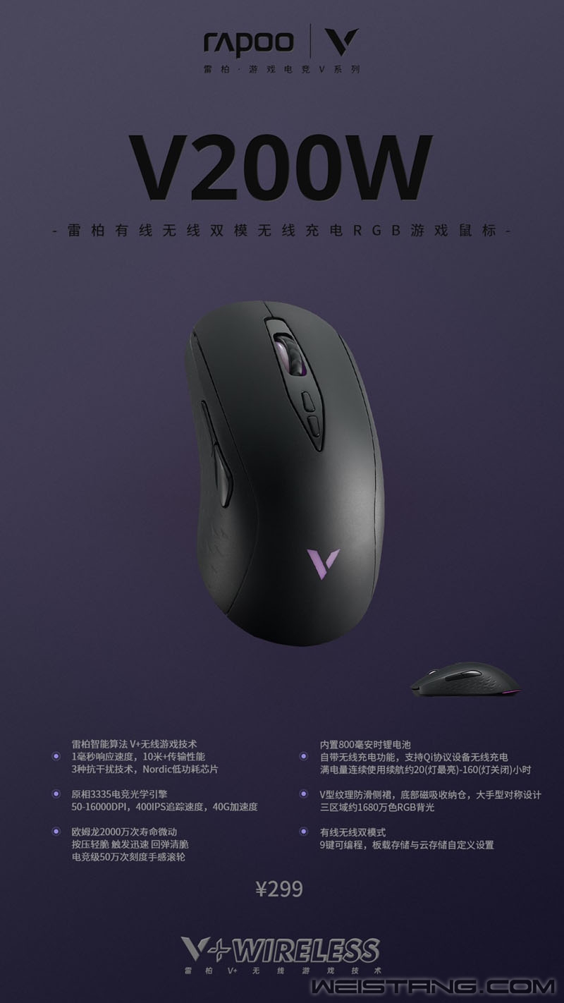 在专业的领域对功能性延续,在外观的追求创造不同的体验,大手纯粹手感、智能算法V+无线游戏技术,原相3335游戏引擎、欧姆龙2000万次清脆手感微动、50万次电竞型手感滚轮、标配无线充,一份更为全面的无线高性价比鼠标代码,已经载入。 大手型左右对称人体工学设计,兼顾趴握、抓握、捏握,纯粹手感载入基因;“V+无线游戏技术”媲美有线鼠标1毫秒的响应速度;加持智能无线传输芯片,引入合适可动态调节发射功率,提供10米+无线传输距离;采用FPC独立天线、自适应信号增强、变频档位调节三重技术抗干扰;Nordic低功耗芯片+雷柏自主研发智能省电算法+800毫安时可循环充电锂电池,续航时长至高可达160小时,组队开黑、深夜鏖战,能量正劲。 内置无线充电模块,适配市面上兼容QI标准的无线充电底座与无线充电鼠标垫,即放即冲,更为简单、高效、稳定的方式来诠释竞技体验。 原相3335电竞光学引擎,50-16000DPI,支持以50为单位逐级调节,预设7档DPI循环切换,游戏操作手感、习惯一键到位;400IPS追踪速度,40G加速度,1000Hz回报率,实时捕捉每一个游戏中的细微操作。视觉上装载1680万色彩RGB背光灯,五种灯效在滚轮、Logo、尾部同时绽放,内敛中自带张扬气场。 通过官方自主驱动软件,9个可编程按键,智能云存储保存多组配置文件,支持开启多种扩展功能。 于细节中触发温度,底部磁吸收纳仓、同时配套替换脚贴、按键防滑贴、1.8m伞绳材质电源数据线、镀金USB接口、USB转接器、让电竞体验更为全面。 点击下方视频,具象化感受竞技快感。 |