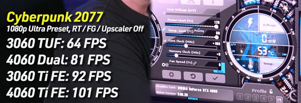 RTX 4060定于29日上市,国内建议起售价2399元。 在NVIDIA公布了RTX 4060的官方性能成绩后,部分Up主的游戏评测内容提前解禁,围绕一款游戏,即《赛博朋克2077》。所谓N家御用游戏,2077对DLSS2/3支持很好,NV自然是信心满满。 跑分方面,在1080P最高画质设定,关闭光追/超分等技术的前提下,RTX 4060 Dual能跑出81FPS,比3060 TUF高出26%,不如RTX 3060 Ti FE,比RTX 4060 Ti FE落后大概20%。 超频方面,RTX 4060天花板有限,TDP最多能从110W干到132W,也就是20%。 频率调高100MHz后,帧数仅仅提升了1.2% |