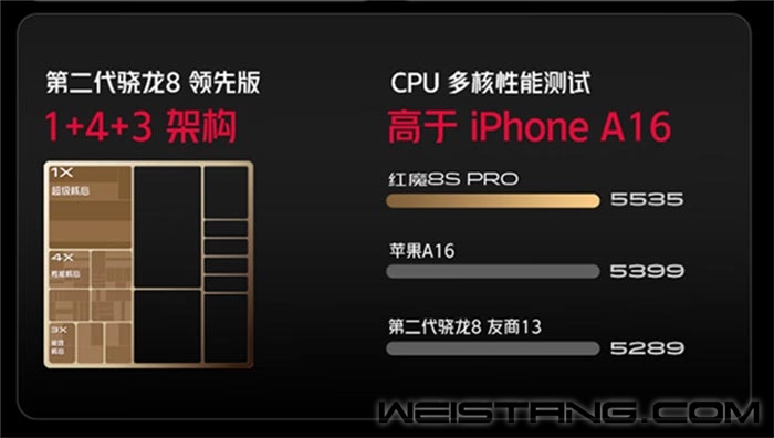 今日上午10:00,红魔8S Pro系列将迎来首销,该系列不仅全球首发高通骁龙8 Gen2领先版,更是首款24GB内存的手机,售价3999元起。 红魔8S Pro的骁龙8 Gen2领先版采用1+4+3架构设计,CPU主频分别为3.36GHz、2.8GHz和2.0GHz,GPU频率为719MHz,CPU多核性能首次超越苹果A16处理器。 另外,骁龙8 Gen2领先版的安兔兔综合成绩超171万分,是目前安卓阵营跑分最高的芯片。 为了让骁龙8 Gen2领先版发挥更稳定、更极致的性能,红魔8S Pro搭载ICE 12.0魔冷散热系统,内置风扇+全贯穿风道、首创3D冰阶双泵VC液冷、屏下石墨烯等散热材料。 红魔8S Pro正面是一块6.8英寸全面屏,2480*1116分辨率,支持120Hz高刷,屏占比高达93.7%,前置为屏下1600万像素镜头。 据了解,红魔8S Pro系列包含红魔8S Pro和红魔8S Pro+两款,前者采用6000mAh电池+80W快充方案,后者为5000mAh电池+165W快充方案,满足续航党和快充党不同需求。 |