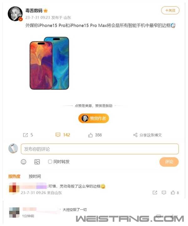 爆料人Mark Gurman透露,苹果把iPhone 15 Pro和iPhone 15 Pro Max的边框做到了1.5mm,是目前边框最窄的iPhone。 爆料指出,苹果在新iPhone上使用一种称为LIPO的技术来实现极窄边框,该技术曾在Apple Watch上使用过。Gurman称,苹果将LIPO技术引入iPhone 后,还希望将该技术引入iPad。 该消息曝光后引发网友热议,有网友表示:“可惜,灵动岛毁了这么窄的边框”,还有网友说“大挖孔毁了一切”。在部分网友看来,苹果灵动岛是一个“糟糕”的设计。 此前罗永浩表示,灵动岛做得非常聪明,这也是因为苹果这些年工业设计实在太烂,倒逼UI设计师不得已憋出来的邪招。 但拿到真机之后,罗永浩称之前的苹果宣传视频造假。因为那个黑的地方你能看到里边的元器件,根本不像宣传视频里做的那么漂亮。其实是很丑的,所以就别提了,我挺难过的,我对这个品牌感到难过。 罗永浩还指出,安卓阵营把不影响美感的居中小黑点前摄、升降式前摄以及视觉完美的屏下隐藏式前摄全都搞出来了,完全没必要学习苹果这种多此一举的设计。 |