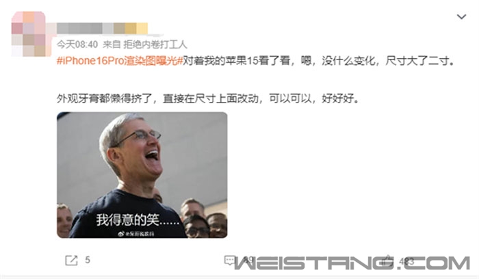 熟悉手机圈的数码爱好者应该都知道,大多数安卓手机外观基本都会一年一变,反观iPhone,近几代的机型几乎都长一个样。 今日,词条#iPhone 16 Pro渲染图曝光#登上微博热搜,引起许多网友围观。 事件起因是MacRumors发布了最新的iPhone 16 Pro系列渲染图,因外观与前代几乎没有区别被网友吐槽。 据了解,iPhone 16 Pro系列除了有更大的屏幕尺寸外,还在电源键下方新增一个按键,预计为拍照视频所用。 对于该渲染图,网友吐槽称:“外观牙膏都懒得挤了,直接在尺寸上面改动”“这和我的15有什么区别,更新一下处理器又是新一代iphone!”“万年不变的外观,没啥创新”等等。 据悉,1995年,苹果创始人史蒂夫·乔布斯曾接受美国公共电视网系列电视节目《书呆子的胜利》栏目采访。 采访中,乔布斯谈到了许多话题,其中就包括大科技公司的创新已经绝种。 彼时,乔布斯用百事可乐举例,称其已经很久没有推出新产品,只是不断更换饮料瓶的大小尺寸,其销售与营销人员为此会获得晋升,并更有效地经营公司。 乔布斯直言,同样的事情也发生在那些垄断的科技公司中。 今年的iPhone 16系列是不是也有29年前乔布斯举例百事可乐只更换瓶子大小尺寸的感觉? |