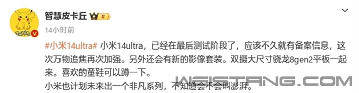 据博主“智慧皮卡丘”爆料,小米14 Ultra已经进入了最后测试阶段,不久后就会有备案信息。 按照之前消息,小米14 Ultra会在三月份正式登场,春节之后很快就会进入预热期。 作为小米的年度高端直板机,影像依然是加强重点,这次将配备5000万+5000万+5000万+5000万全焦段四摄,包含一颗主摄索尼LYT900、一颗3.2倍直立长焦、一颗5倍潜望长焦以及一颗超广角。 主摄支持可变光圈,可在f/1.6-f/4.0之间调节,进光量遥遥领先,长焦也支持OIS光学防抖。 核心配置上,小米14 Ultra采用全等深微四曲屏幕,分辨率为2K,搭载高通骁龙8 Gen3移动平台,电池是5180mAh。 小米14 Ultra的配置非常全面,不仅补足长焦微距、超声波指纹等遗憾,这次还会用上卫星通信技术。 这是小米首款支持卫星通信功能的手机,而且是采用了小型化芯片的双向卫星通信,在无地面网络时能与外界取得联系。 在补齐了短板,并跟进了行业最先进的创新技术之后,小米14 Ultra将会在高端之路上进一步上探,配合上全新的澎湃OS,将会与华为和iPhone进行正面硬刚。 |