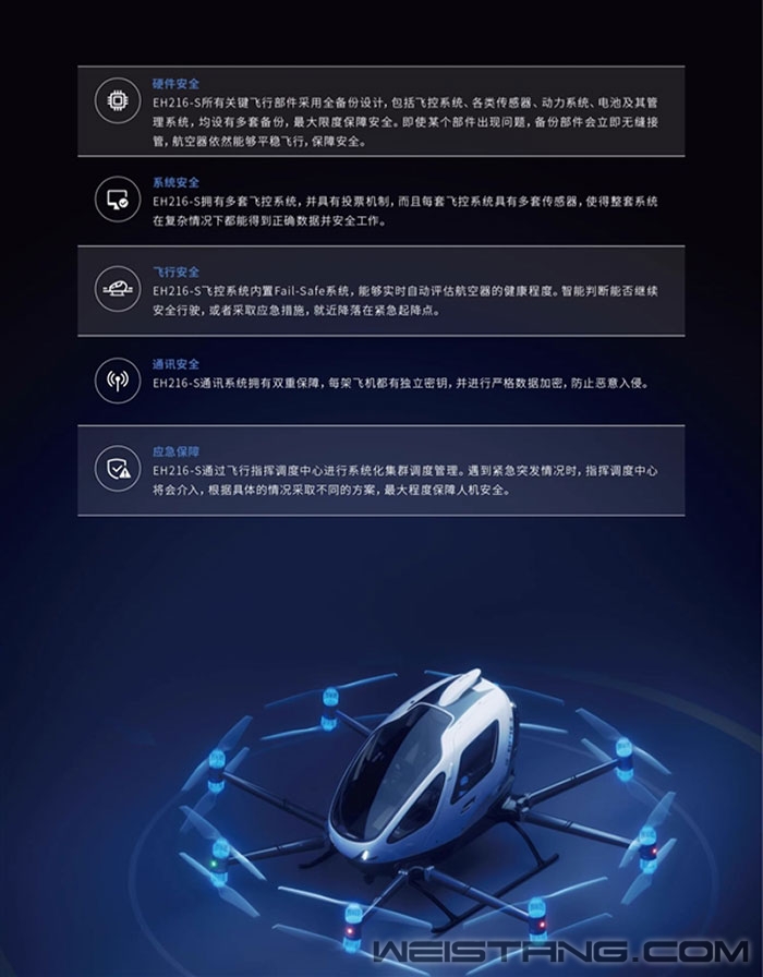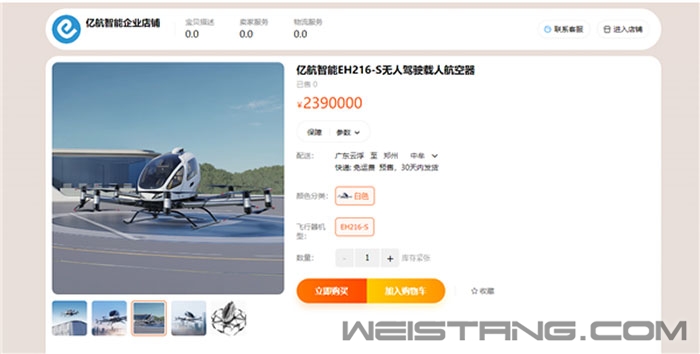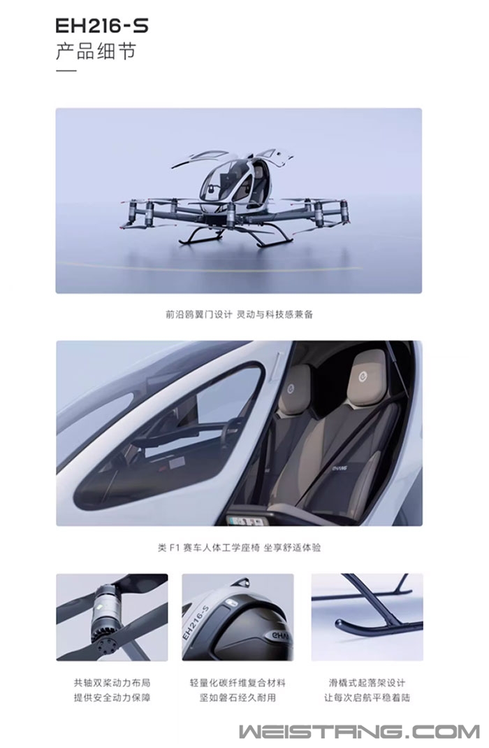 随着科技飞速发展,以前在科幻电影中才能看到的酷炫无人驾驶“空中的士”,已经来到现实生活。 今日,全球首个获得适航认证的国产自研“空中的士”亿航EH216-S在淘宝上架,标价239万元。 测试飞行 据了解,该“空中地市”为全智能无人驾驶航空器,可搭载两人,能够全智能低空飞行和垂直起降,完全不需要跑道。 2023年,EH216-S获得了由中国民航局颁发的全球首个无人驾驶载人eVTOL航空器型号合格证与标准适航证。 EH216-S机身长5.73米,高1.93米,2小时内就能充满电,最快飞行速度达130公里/小时,续航时间25分钟,设计航程30公里。 EH216-S所有关键飞行部件采用全备份设计,包括飞控系统、各类传感器、动力系统、电池及其管理系统,均设有多套备份,最大限度保障安全。 即使某个部件出现问题,备份部件会立即无缝接管,航空器依然能够平稳飞行,保障安全。 应急保障上,EH216-S通过飞行指挥调度中心进行系统化集群调度管理,遇到紧急突发情况时,指挥调度中心将会介入,根据具体的情况采取不同的方案,最大程度保障人机安全。 据介绍,EH216-S可广泛应用于载人交通、旅游观光、物流运输、医疗急救等场景,迄今已在全球14个国家完成超4万架次安全飞行。 |
