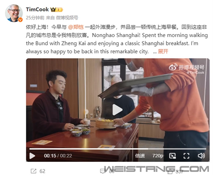 今日,苹果CEO库克在个人微博发布了视频,分享了他与郑恺在上海外滩漫步并品尝传统上海早餐的经历。 “回到这座非凡的城市总是令我特别欢喜”库克说道。 视频显示,库克与郑恺一同游览了上海北外滩著名的外白渡桥,两人还在桥上以东方明珠塔为背景合影留念。 随后,库克与郑恺品尝了上海经典早餐汤包,不得不说,库克用筷子的技巧相当娴熟。 据了解,库克此行上海是为了参加明天晚上上海静安Apple Store的开业活动。 上海静安Apple Store是大中华区的第57家苹果门店,同时也将成为中国最高规格的苹果旗舰店。 该地址位于上海市静安区南京西路1699号,地理位置优越,正对着静安寺。 据爆料,上海静安Apple Store占地面积3835平方米,总投资超过8340万元,仅次于纽约第五大道的苹果零售店。 |
