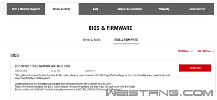 针对最近频繁爆出的Intel 13/14代酷睿i9系列不稳定的问题,华硕特意发布了新版BIOS,引入了一个名为“Intel基准配置”(Intel Baseline Profile)的新选项。 华硕表示,开启这个选项,可以将主板的默认设定切换为Intel推荐的出厂设定,涵盖基本功能、功耗限制等,从而改进在特定游戏中的稳定性。 相信其他主板厂商也会迅速跟进,发布类似的新BIOS。 近几个月,大量玩家发现,13/14代酷睿i9甚至是i7处理器频繁出现崩溃问题,要么很多虚幻5引擎游戏无法正常运行(提示显存不足),要么在使用几个月后各种蓝屏死机。Intel表示已知晓并进行调查。 根据各方面分析认为,13/14代酷睿i9/i7的频率、功耗拉得过高,而主板厂商普遍“偷懒”将功耗限制设定在近乎无限的4096W,导致实际功耗太高而崩溃。 比如在游戏中,崩溃基本都发生在着色器编译阶段,也就是屏幕上看到载入的时候。 根据网友反馈,受影响型号包括i9-14900K/KS/KF、i9-13900K/KS、i7-14700K、i7-13700K等等,尤其是13900K、14900K比较多,可能是因为高端玩家普遍会选择它俩。 之前的临时解决方法就是降频,比如200MHz,就能稳定了。 根据外媒实测,新BIOS提升稳定性的同时,确实付出了大家,就是性能缩水。 比如i9-14900KS,CineBench R23多核心跑分就降低了接近13%,已经不如锐龙9 7950X,全球第一个6.2GHz也失去了意义。 新BIOS 旧BIOS |