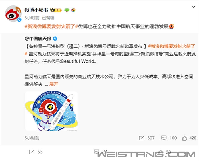 据“中国航天报”报道,星河动力航天将于近期择机实施“谷神星一号海射型(遥二)·新浪微博号”商业运载火箭发射任务,任务代号:Beautiful World。 当前此次发射任务的徽章已经发布,最吸引人的当属微博的标志,也就是人们常说的“大眼仔”,而且此次它穿上了宇航服。 报道称,星河动力航天是国内领先的商业航天技术公司,致力于为人类低成本、高频次进入空间提供解决方案,以“连接地球与太空”为使命,创造了民营火箭首家实现九连胜。 达成了首家进入500km太阳同步轨道、800km倾斜轨道和晨昏轨道,首家成功实施海上发射,首家实现火箭量产和高密度发射等多个行业里程碑。 而新浪微博于2009年上线,是用户在线创作、发现和分享内容的社交媒体平台,秉持“以微博之力,让世界更美”的理念,以兴趣社交为核心驱动,打造了丰富多元的内容生态,集聚了不同领域KOL资源,形成了公开、开放、互动式的社交场域。 航天领域在微博平台上备受瞩目,微博也在全力助推中国航天事业的蓬勃发展,此次跨界合作,是中国商业航天与社交媒体平台的首次创新融合,体现了双方对助推商业航天事业发展的美好愿景。 |
