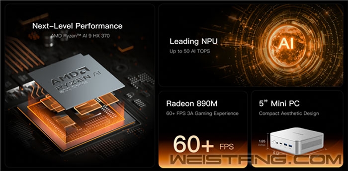 铭凡在美国正式发布了其首款基于AMD Zen5架构的新一代迷你机“EliteMini AI370”,并透露了预售福利。 目前,铭凡还未公开全部规格参数,只透露了一部分处理器的相关信息。 处理器是旗舰级的锐龙AI 9 HX 370,12核心24线程,最高频率5.1GHz,CineBench R23单核跑分2035、多核跑分23786,对比上代锐龙7 8845HS分别提升15%、46%。 Radeon 890M集显游戏性能提升30%,可以在大量3A游戏中跑出60+FPS的流畅帧率,比如《F1 23》 113FPS,《博德之门》87FPS、《古墓丽影暗影》77FPS,《Far Cry 6 》63FPS。 NPU算力最高50 TOPS,平台算力达80 TOPS。 整机外观重新设计,长宽高尺寸只有130x127×47毫米,非常紧凑,并提供丰富的接口: 前置一个USB4、两个USB 3.2、一个3.5mm,后置一个HDMI、一个DisplayPort、两个USB 3.2、两个RJ-45网口,还有电源接口和一排散热开孔。 可惜,没有Oculink外置显卡接口。 铭凡正式发布AMD Zen5迷你机EliteMini AI370:首发有重大福利 铭凡EliteMini AI370已经启动预售,具体价格没有说,不过注册可领取50美元折扣,北京时间29日10点正式开卖,国内发售时间暂未公布。 |
