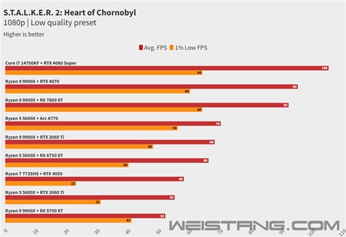 《潜行者2:切尔诺贝利之心》媒体口碑现已解禁,截至发稿,本作在M站获得73均分。 pcgamer发布了本作的技术分析评测,测试人员指出游玩的几个小时内遇到了多次崩溃、卡顿和错误,游戏表现显然并不是其今年测试过的所有游戏中最好的,但它绝对是最有趣的游戏之一,还有很大的改进空间。 测试人员指出,在高端配置系统(例如Core i7 14700KF和RTX 4080 Super的组合)上,游戏在4K分辨率、最高画质预设下运行相对流畅,前提是启用了DLSS等升频技术和帧生成功能。如果关闭帧生成,表现尚可,但不够稳定。 对于配置稍低一些的显卡(如RTX 4070或RX 7800 XT),情况类似,不过建议使用1440p分辨率和高画质预设。 问题出现在低端PC配置上。 GSC Game World最低要求是Core i7 7700K搭配GeForce GTX 1060这样的配置,足以支持1080p分辨率和低画质下的30帧运行。 从测试看,这一说法基本成立。 不过,这样的老旧CPU需要很长时间处理着色器编译,同时会对1%低帧率造成明显影响。换句话说,游戏体验并不理想。 而考虑到即便是顶级配置的PC也可能在《潜行者2》中遇到卡顿和性能问题,八年前的CPU和GPU组合可能会面临更多困难。至于光追功能,测试指出大部分PC配置都可以体验,但入门门槛很高。 1080P低预设帧率表现 1080P高画质预设帧率表现 |