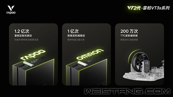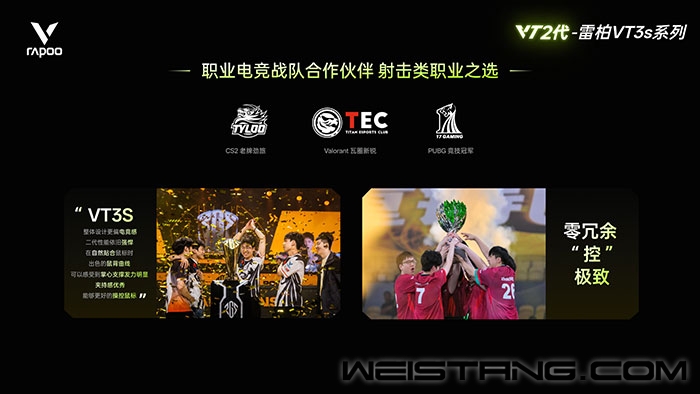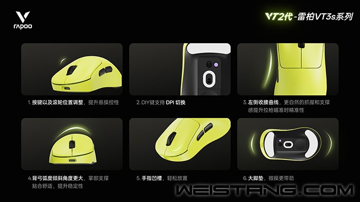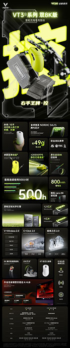 一个值得回答的问题是:当旗舰级跨代芯片成为无线电竞鼠标的标配,VT二代作为雷柏「史上最强鼠标」的一代,如何掀起对于电竞市场的「降维打击」? 雷柏V+Wireless 2.0无线电竞算法、“极客之芯 2.0”自研模块化结构、“C+Click 2.0”按键预压加强防掰抗摔保护、外设全家桶A HUB驱动,一个更「懂你要什么」的雷柏2.0技术平台技术底座,能快速为玩家打造「真就不一样」的雷柏VT二代。 如果说VT7二代系列、VT3二代系列完成了的精彩首秀,那么基于玩家的声音:“中小手要能时刻贴合手掌,减少存在感!兼顾低调和辨识度,性能强大又舒适,要保留大电池不要DPI键!” 而诞生的雷柏VT3s,精准回应了年轻人日益多元且愈发理性的产品需求。 预热即火爆,不只是体验的代际跃迁,雷柏VT3s二代系列无线电竞鼠标,中小手,约49g,全球首发NORDIC 54跨代芯片,原生级双8K回报率,500小时连续使用时长为「高性能」撑腰,199元起上市普及换代。 ≥20000FPS全段固定扫描帧率,满帧怎么玩续航都顶得住! 『右手王牌 · 控』VT3二代系列,零冗余设计,“控”极致如何设计? 要魄力更要实力!一向擅长把对玩家意见的反馈,体现在下一次迭代中的雷柏,在乎“一群人”对“一个鼠标”关于舒适度、设计感和无线性能的共鸣。 “VT3”作为目前颇受认可的右手非对称人体工学鼠标,在设计同系列中小手时,始终保持玩家至上的基因,根据玩家反馈超过几十次的细节微调,取消DPI键,没有多余的设计,整体更偏电竞感,只有为了抓握、趴握舒适、更舒适、极端的舒适,在自然贴合鼠标时,背弓弧度倾斜角度更大,掌心支撑发力明显,夹持感优秀,左侧收腰弧度提升拉枪瞄准时的精准性。 在一个数字原生代如此强调情绪共鸣的时代,VT3s系列新增炽光黄,打破传统色彩,融合质感与舒适,大胆、自信的未来感更竞技更激情。 从美学设计上的「好看」,到触感体验上的「好用」,VT3s一共有无涂层双版本,VT3s MAX星空黑、皎月白、炽光黄 | VT3s炽光黄采用亲肤防滑涂层,VT3s星空黑、皎月白为类肤磨砂工艺。温润细腻的涂层工艺,处理做防滑表面,汗手友好,进一步增加了对鼠标的操控感。 『右手王牌 · 控』VT3二代系列,只有NORDIC 54芯片,才配得上≥20000FPS全段扫描 【首发芯片】全系标配NORDIC 54跨代芯片,性能更高,功耗更低,对比NORDIC 52芯片,2倍主频提高,2倍无线数据传输带宽提高,在速率、时延、定位、精准性等方面带来了更为显著的性能提升,快、稳、准一步到位。 【回报率得用真实的】原生级双8K回报率,真实数据量,出厂即写入,0.125ms低延迟稳如泰山,显示快人一步,每秒多开一枪! 【疯狂玩续航】续航巨无霸,连续使用不间断,1K回报率下最高500小时,4K回报率下最高120小时,8K回报率下最高100小时。 【安全阈值扫描帧率】MAX版提供≥20000FPS的全段固定扫描帧率,敏捷度跟手感直接拉满,满帧更持久! 【价格最香】199元起普及次世代鼠标性能体验! 【全系赠送专业竞技级体验配件】8K带编织屏蔽和镀金接口的高速数据线、更高纯度的“冰感”电竞大脚垫、减少信道干扰的USB转接器、带RGB电量指示灯的nano 8K接收器。 【最全面最实用的驱动】个性化也是玩家不可磨灭的底色,外设全家桶A HUB提供更为精细化的电竞功能,兼容Windows和macOS双系统,7月网页驱动上线,板载存储与云存储,一个驱动满足所有外设,多种驱动版本满足设备需求,更懂玩家的软件! #雷柏VT3s标准版# 目前最具性价比中小手,跨代性能刷新电竞体验上限 · 定制电竞传感器原相3398(高定版3395) · 1亿次欧姆龙机械微动,手感轻脆 · TTC 200万次定制编码器 · 50-26000 DPI,灵敏度以50为单位可调 · 1-2mm 11档静默高度可调,精度0.1mm · 1K回报率下最高500小时,4K回报率下最高120小时,8K回报率下最高100小时 #雷柏VT3s MAX版# 跨代极致性能,强调的是「极致」 · 定制电竞传感器原相3950 Ultiamate · 1.2亿次定制光微动,欧姆龙机械微动声音特调,整体性强又脆又爽 · TTC 200万次定制编码器 · 10-45000 DPI,灵敏度以10为单位可调(10-10050) · 0.7-1.7mm 11档静默高度可调,精度0.1mm · 1K回报率下最高500小时,4K回报率下最高110小时,8K回报率下最高100小时 炽光黄、星空黑、皎月百,带上你的专属配色,制控全场! 雷柏VT3s二代系列,雷柏想讲的,始终是更好的电竞产品、更好的操控体验,更好的玩家故事。6月10日,199起,无线电竞鼠标换代普及更多! *该重量测试基于黑色款式,不含接收器&收纳仓盖,因配色、测试环境等不同,实际数据可能会有±3g公差浮动,以实际产品为准。 *数据来源实验室测试。 *续航时长依使用情况和配置的不同可能会有差异。VT3s二代系列1K回报率最高续航时长为500小时,4K最高续航为120小时(VT3s MAX为110小时) |