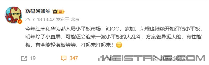 在小尺寸平板市场,苹果iPad mini系列多年来几乎独占鳌头。 如今,越来越多的国产厂商开始重视被iPad mini占据的小平板市场。 今日,数码博主“数码闲聊站”表示,今年REDMI和华为都入局小平板市场,vivo子品牌iQOO、OPPO、荣耀也陆续开始评估小平板,明年可能会迎来一波小平板的大乱斗。 这些国产小平板方案差异很大,有主打性能的,也有主打全能轻薄的。 据了解,今年6月,对标iPad mini的REDMI K Pad发布,这是REDMI首款旗舰小平板,售价2799元起。 K Pad采用8.8英寸LCD屏幕,分辨率为3008*1880,支持165Hz刷新率,拥有403ppi、700尼特全局亮度,搭载天玑9400+旗舰处理器。 据爆料,华为的小尺寸平板预计9月发布,屏幕也是8.8英寸,采用16:9的比例,预计支持蜂窝网络。 |