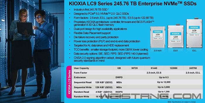 铠侠(Kioxia)宣布推出LC9系列固态硬盘,具有史无前例245.76TB存储容量的固态硬盘,成为目前最大容量的存储设备。 这款SSD专为需要极高存储密度的应用场景设计,例如人工智能训练和超大规模数据中心工作负载。 铠侠通过将8TB的存储容量集成到单个NAND封装中,创造了新的纪录,并利用多个超高容量封装构建了这款超大容量的SSD。 以一部4K电影平均压缩后约20GB的大小计算,这款SSD可以存储多达12500部4K电影。 铠侠LC9系列基于一种未知的专有NVMe 2.0兼容控制器,配备PCIe 5.0 x4接口(支持双端口),并采用了铠侠的BiCS8 2Tb 3D QLC NAND闪存芯片。 为了在E3.L外形尺寸中实现245.76TB的容量,铠侠将32个存储芯片集成到一个芯片中(8TB存储空间),并将其连接到控制器。 铠侠声称,这种封装方式在密度上创下了新纪录,并使用了该公司专有的晶圆处理和组装方法。 性能方面,LC9系列SSD的顺序读取速度最高可达12GB/s,写入速度最高可达3GB/s,随机读取IOPS可达130万次,随机写入IOPS为5万次。 虽然这些性能指标在企业级PCIe 5.0 SSD中并不算最高,但考虑到其巨大的容量,性能与容量之间的平衡是必然的。 耐用性方面,LC9系列SSD的耐久性为每天0.3次全盘写入(DWPD),同时还具备多种增强可靠性和数据保护的功能,包括芯片级恢复、基于奇偶校验的错误管理以及防止突然断电的安全措施。 铠侠计划提供多种外形尺寸的LC9系列SSD,包括2.5英寸U.2(最高122.88TB)、E3.S(最高122.88TB)和E3.L(最高245.76TB)。 |