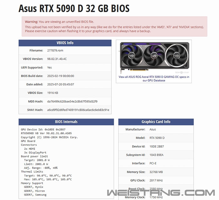 近日华硕ROG夜神RTX 5090D显卡的一款非官方的BIOS文件出现在网络上,这款BIOS将显卡的功耗限制提升到了惊人的2001W,几乎是标准575W功耗限制的三倍半。 当然,由于功耗提升了这么多,很可能会使其原装散热解决方案不堪重负,因此用户可能需要定制的水冷(或液氮)来确保显卡不会过热损坏。 而且用户还需要一个能够提供如此大功耗的电源,此外由于这是未验证的BIOS,安装后显卡的保修将自动失效。 这并非我们首次看到功耗达到千瓦级别的显卡BIOS,前几天,影驰拥有双16Pin的RTX 5090D名人堂的一款BIOS也在网上出现,同样拥有高达2001W的功耗。 不过影驰的这款显卡仅在国内销售,而ROG 5090夜神则在全球都有销售,虽然泄露的BIOS是针对于RTX 5090D,但 VideoCardz指出它可能与所有ROG夜神RTX 5090兼容。 RTX 5090D已经停产,但对于拥有这张卡的用户来说,可以通过这个BIOS将功耗限制从接近600W提升2001W瓦特。 但请记住,除非你是专业的超频玩家,否则不要轻易尝试。 |