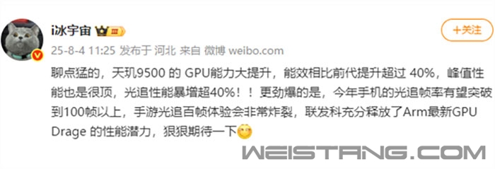 据博主数码闲聊站最新爆料,联发科天玑9500这一代的NPU会用上全新IP硬件,AI算力对比前代直接翻倍。 此前爆料称,天玑9500搭载第九代AI处理器NPU,可提供100TOPS的AI算力。 如今手机上各种AI功能层出不穷,比如影像算法、消除反光、智能扩图、一键打车、一键点外卖等等,对于AI算力的要求也越来越高。 这次天玑9500直接拉爆,预计能催生出不少更强大、更方便的AI玩法,智能手机距离钢铁侠“贾维斯”那样的助手越来越近了。 另外,博主还透露天玑9500将推出类似“存算一体”的能效黑科技架构,目前大概率在手机芯片中首发落地。 综合已知信息,天玑9500采用了全新的“全大核”设计,由1颗主频高达4.21GHz的Travis超大核、3颗主频3.50GHz的Alto大核以及4颗主频2.7GHz的Gelas大核组成。 Travis和Alto都是Arm打造的Cortex-X9系超大核,Gelas是Arm Cortex-A7系大核,在提升IPC(每周期指令数)性能的同时,整体能效实现跨越式升级。 Geekbench 6跑分数据显示,其多核跑分甚至突破1.1万分,超越苹果A19 Pro,与高通骁龙8 Elite 2不相上下,能够轻松应对多任务处理、大型游戏、视频编辑等各类高负载任务。 GPU则是全新的Mali-G1-Ultra MC12,采用全新微架构,GPU能效预计将提升超过40%,移动端光线追踪性能有望暴增40%以上,光线追踪帧率有望突破100FPS,带来100+FPS的光线追踪手游体验。 此外,天玑9500在缓存与内存方面也进行了升级,配备16MB的L3缓存和10MB的SLC,支持4通道LPDDR5x内存,速率可达10667Mbps,并兼容UFS 4.1闪存,进一步提升整体性能表现。 |