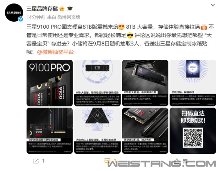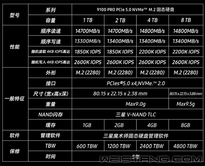 今日,三星9100 PRO SSD 8TB国行版正式开售,售价6399元。 9100 PRO是三星首款满血PCIe 5.0 SSD,读取速度高达14.8GB/s,刷新消费级SSD速度纪录。 三星9100 PRO给足了PCIe 5.0x4通道,再加上NVMe 2.0,性能得以全速释放,与前代990 PRO相比,整体性能提升高达99%。 据了解,8TB版本顺序读取速度为14800 MB/s,顺序写入速度13400 MB/s,随机读取速度可达2200K IOPS,随机写入2600K IOPS。 三星9100 PRO配备三星最新自研主控芯片,采用5nm工艺和低功耗架构,8TB版配备厚度为11.25mm的散热片,同时优化热控制,确保稳定的高速性能且不会过热。 据悉,8TB版写入寿命达4800TBW,提供5年质保。 |