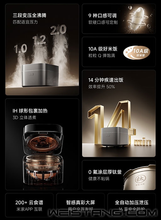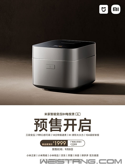 小米今天公布了一款重磅家电产品——米家智能变压IH电饭煲4L。 官方强调,这是米家首款智能变压IH电饭煲,首发价1999元,建议零售价是2299元。 配备1390W大功率IH加热系统,采用14000mm超长IH线圈,实现底侧IH环绕加热+上盖恒温环+腰部热感环的3D立体透煮,从锅心到边角热量均匀覆盖,避免局部夹生。 保温阶段可维持8小时米饭不干硬,取出时仍保持现煮般蓬松口感。 内胆采用3mm厚制熔钛复合材质,内部为钛粒子与超硬晶体保护层,彻底杜绝特氟龙涂层,经检测重金属0析出,符合食品接触级安全标准,同时达到国家标准二级不粘性能。 采用专利三段变压技术,针对不同食材特性匹配差异化压力,解决传统电饭煲单一压力难以兼顾多种烹饪需求的问题: 1.2倍微压煮白米:提升锅内温度,使米粒充分糊化,煮出的白米晶莹透亮、Q弹有嚼劲; 2.0倍高压烹杂粮:高压环境下无需提前浸泡杂粮,可穿透食材内部,煮后杂粮芯软透香、不硌牙; 1.0倍常压煲仔饭:维持常压状态,保证锅巴金黄焦脆,米饭干爽分明,还原传统煲仔饭口感。 同时,搭载专利持久沸腾技术,三段压力模式下均能实现超长时间持续沸腾,米水强劲对流让米粒剧烈翻滚,深层糊化更充分。 经检测,相较于米家前代电饭煲,该产品煮出的米饭香气浓度提升52%、天然甜味提升58%、蓬松度提升22%,达到《电饭煲烹饪米饭品质评价方法》10项A级标准(蓬松度、平整度、含水率、香气等)。 功能性方面,支持“黏度+软硬”两大维度调节,组合出9种口感方案,覆盖不同人群需求。 快煮饭功能针对1杯米(约2碗饭)场景,烹饪时间仅需14分钟,相较于米家电饭煲N1 3L/4L的28分钟快煮时长,效率提升50%。 支持米家APP互联,可远程预约煮饭、煲汤,下班路上启动程序,到家就能直接吃上热饭。 此外还支持炖肉、煲汤、蒸菜、无水焗等多种功能,提供4种专用压力模式。 整机3年质保(机器本身零件),内胆1年质保。 |