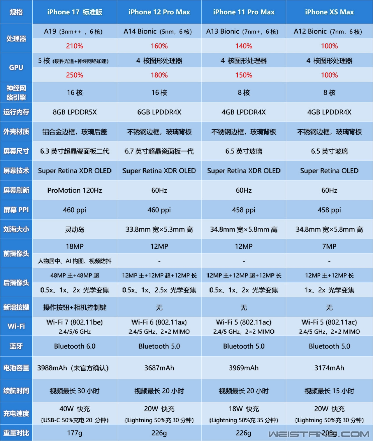 | 这次iphone 17的四款手机中标准版可能是最有诚意的,终于给了高刷,同时屏幕玻璃还给了超晶瓷二代,抗刮能力提升3倍。前摄传感器大升级,支持视频防抖与拍摄人物居中等非常实用的功能。屏幕方面,相比去年的16标准版,在屏幕尺寸方面也从6.1寸提升到了6.3寸,电池续航提升也非常显著,256GB容量起步,对于很多还在用老Pro或者Pro Max的用户来说是不错的升级方案! 下面给大家分享一下iphone 17标准版对比12pro max、11pro max以及xs max这三款手机的配置区别。 |