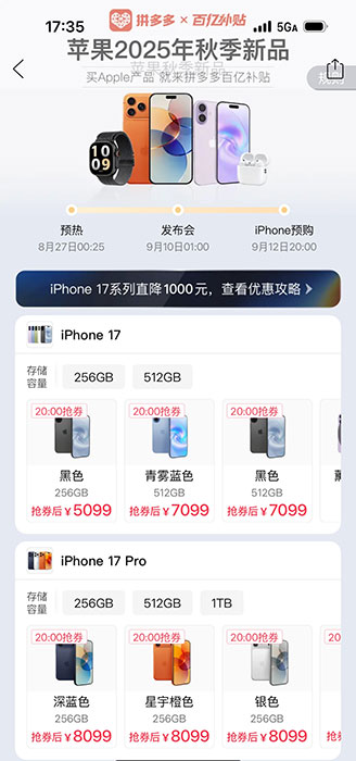 9月12日晚8点,拼多多百亿补贴正式上线苹果2025年秋季全系新品,并推出史上最大力度的补贴福利,iPhone 17系列新品开售直降1000元! 在此次上新中,与官网价格相比,iPhone 17低至4999元,iPhone 17Pro低至7999元,iPhone 17ProMax低至8999元。同时,Apple Watch Ultra 3券后直降500至5999元;AirPods Pro 3券后直降300元至1599元等。 广大消费者只需打开拼多多百亿补贴,点击进入苹果新品专属页面,选择想要购买的新品,在平台补贴价的基础上准点领取“商品无门槛券”,至高可再减700元。 此外,消费者还可在百亿补贴频道右上角点击进入“积分”活动页,在“限时抢券活动”专区,使用积分兑换“iPhone 17系列新品积分优惠券”,至多可再兑换100元,累计直降1000元。 除此之外,拼多多百亿补贴还为消费者提供“正品保障、全国联保、假一赔十、买贵双倍赔”等售后无忧服务,此次开售的全系新品均采用顺丰快递,最快次日即可送达消费者手中。 活动当晚,拼多多百亿补贴仍是广大消费者购买苹果手机的最香选择,iPhone 17系列多款新品一经上线即遭秒罄,火爆程度远超去年新品上线同期。 在社交媒体上,很多消费者已经开始分享在拼多多抢购新品的惊喜体验,直言“便宜了1000块,简直优惠拉满”“买苹果17,拼多多最香”“目前全网优惠幅度最大的首发平台”等。 |